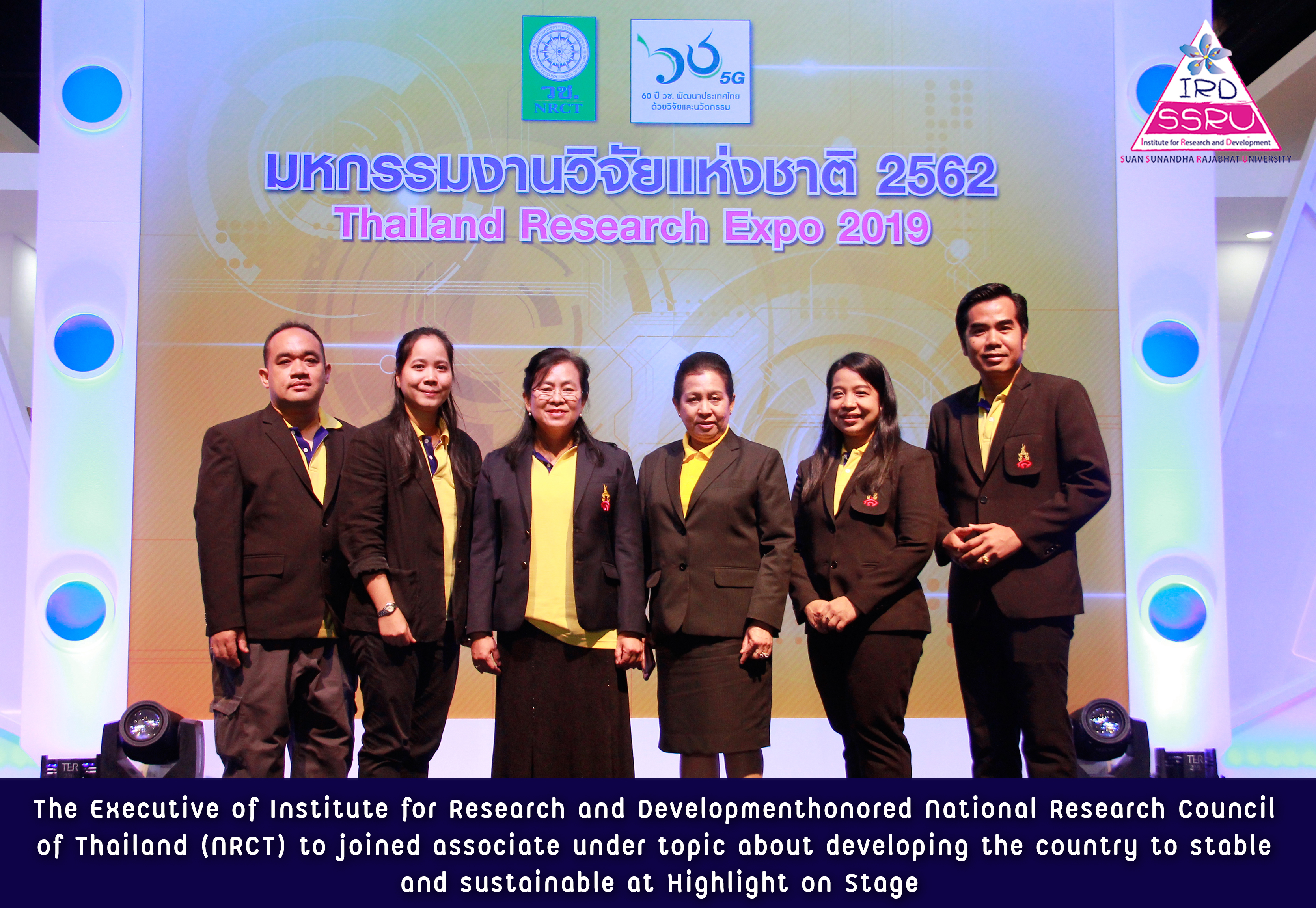 On April 10, 2019, 11.00 – 12.00 hrs., at Centara Grand at Central World Bangkok. Thailand Research Expo 2019 held by National Research Council of Thailand (NRCT) for shown about innovation and research results from universities throughout the country. This year the Institute for Research and Development honored National Research Council of Thailand (NRCT)to joined associate under topic about developing the country to stable and sustainable at Highlight on Stage. Asst. Prof. Dr.SuwareeYordchim, Asst. Prof. Dr. RojanaChantrasa, Vice Director for Research and Publication, Asst. Prof. Dr.PhusitPhukamchanoad, Vice Director for Academic Affairs and Training Service, Asst. Prof. Dr. YutthanaSudjarern, Deputy Director Administrative and Khun Pornthip Ruangprad, Head of the Office of Institute for Research and Development participated in this association.