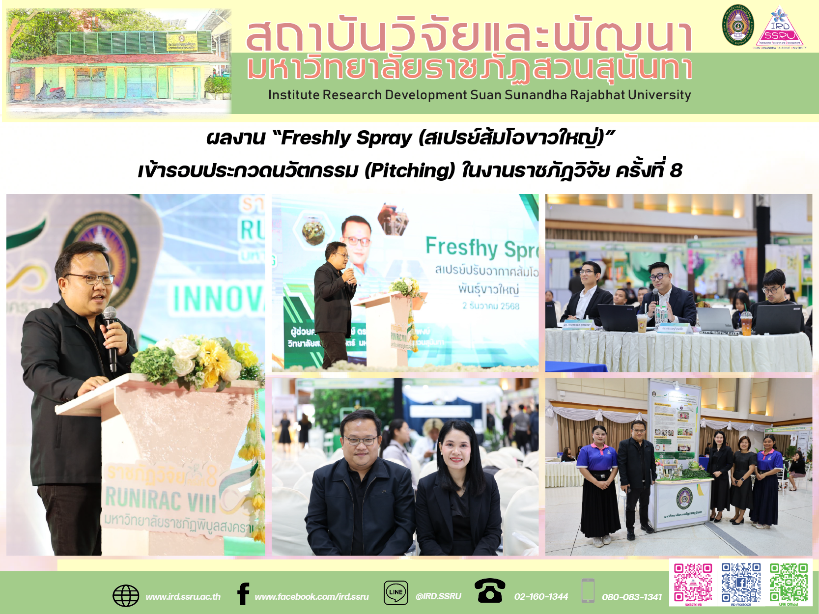 From 1–3 December 2025, researchers from Suan Sunandha Rajabhat University were selected to present their work in the Innovation (Pitching) session at the 8th Rajabhat University National and International Research and Academic Conference (RUNIRAC VIII), held under the theme “Research and Innovation for Local Development toward Internationalization and the SDGs” at Sriwachirot Auditorium, Pibulsongkram Rajabhat University, Phitsanulok.