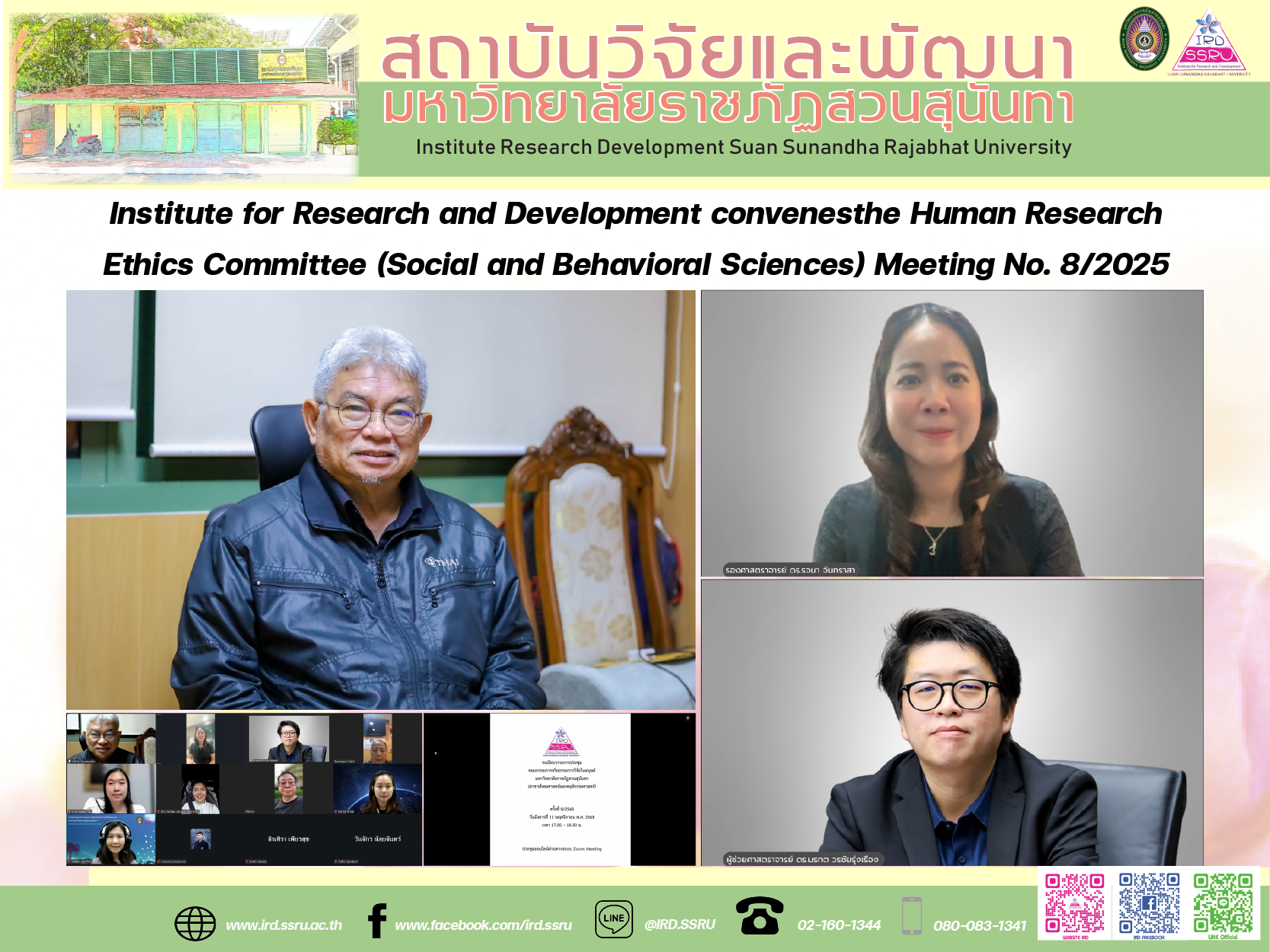 On 11 November 2025, 17:00–18:30 hrs, the Institute for Research and Development (IRD), Suan Sunandha Rajabhat University, convened the Human Research Ethics Committee (Social and Behavioral Sciences) Meeting No. 8/2025 in an online format via Zoom Meeting. The session considered protocol approvals and reviewed progress to ensure that research ethics practices comply with international standards.