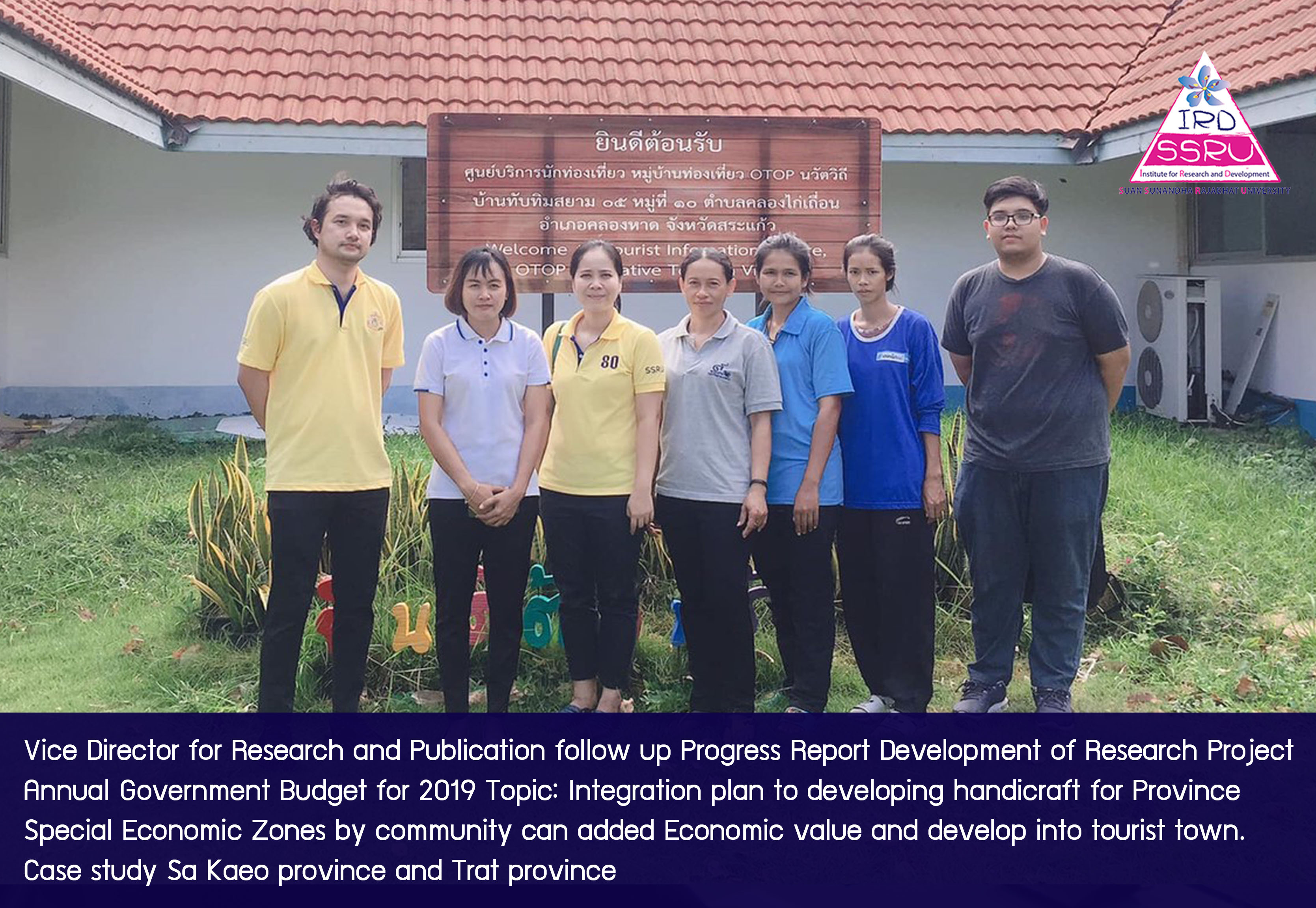 On July 18, 2019 at 10.00-14.30 hrs., Asst. Prof. Dr. Rojana Chantrasa, Vice Director for Research and Publication together with working group follow up Progress Report Development of Integration plan to developing handicraft for Province Special Economic Zones by community can added Economic value and develop into tourist town. Case study Sa Kaeo province and Trat province by Mr. Kanin Pawanrat from Creative Products Design, Faculty of Fine and Applied Arts share knowledge about apply the remainders from Oil refining as such Plai (Zingiber montanum), Turmeric (Curcuma longa) to dye fabric for wrapping Thai Herbal compress and including to development of packaging also recommending to do household accounting.