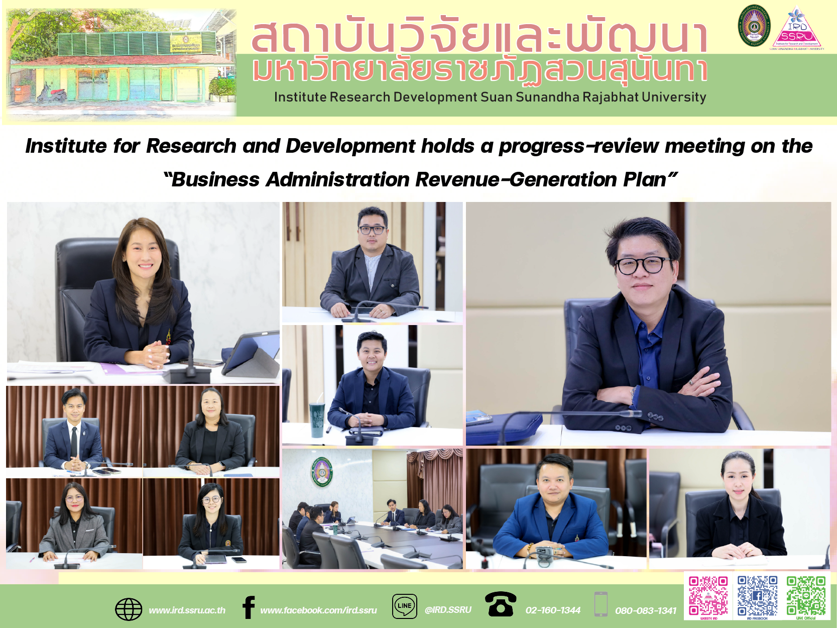 On 18 November 2025 at 13:00 hrs, the Institute for Research and Development (IRD), Suan Sunandha Rajabhat University, convened a progress-review meeting for the Revenue-Generation Project under the Institute’s Business Administration Plan at the Office of the President Meeting Room, 5th Floor.