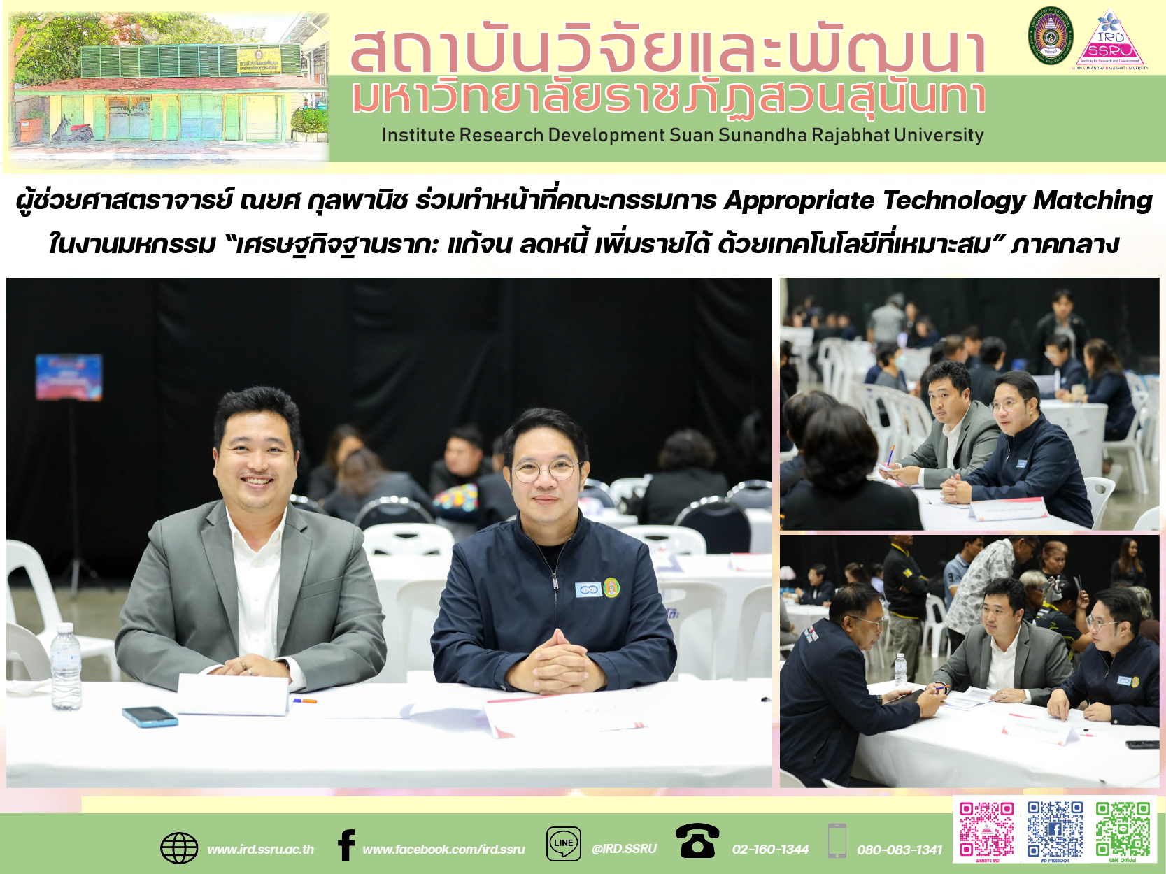 ผู้ช่วยศาสตราจารย์ ณยศ กุลพานิช ร่วมทำหน้าที่คณะกรรมการ Appropriate Technology Matching ในงานมหกรรม “เศรษฐกิจฐานราก: แก้จน ลดหนี้ เพิ่มรายได้ ด้วยเทคโนโลยีที่เหมาะสม” ภาคกลาง