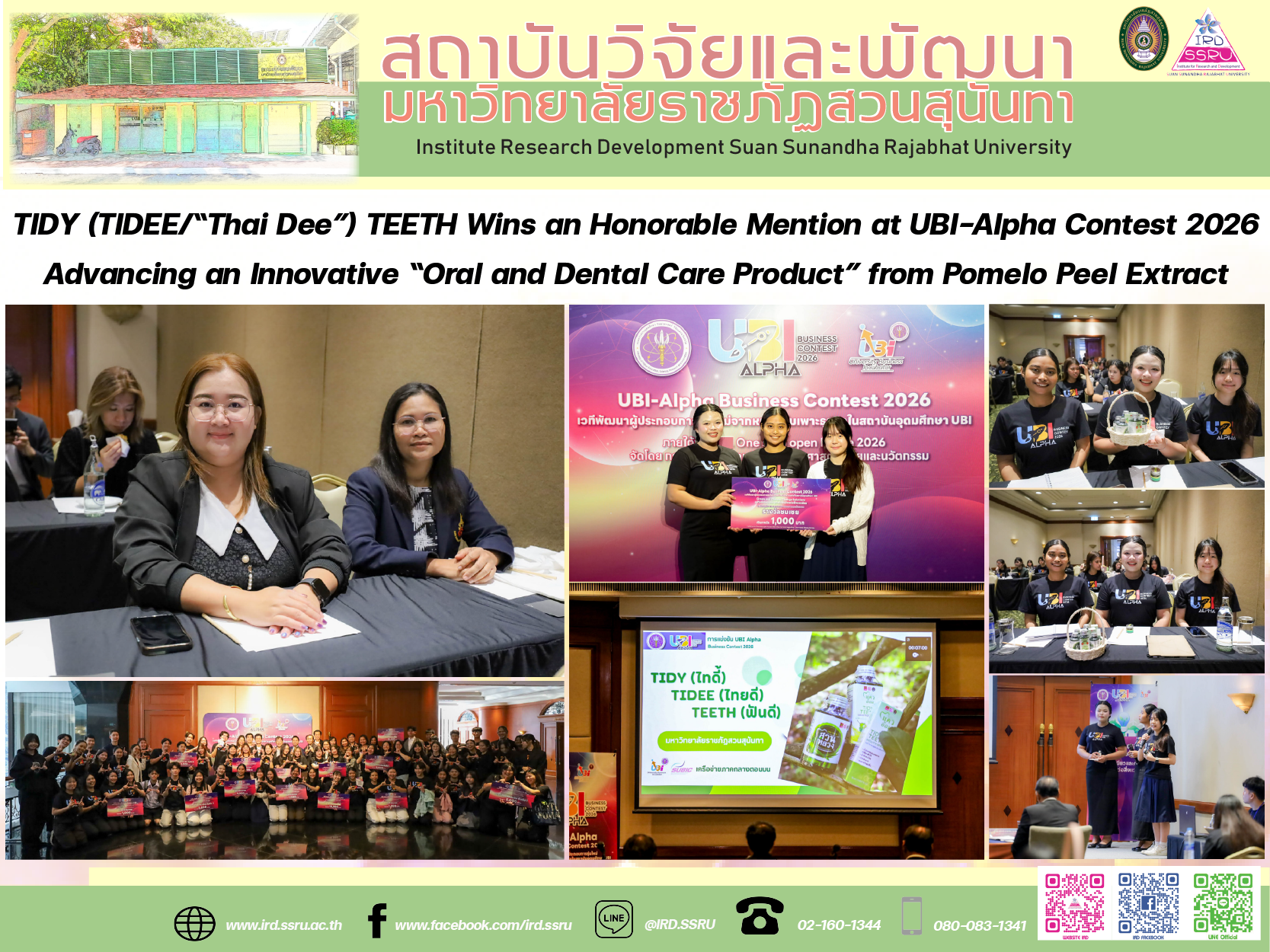 Congratulations to Suan Sunandha Rajabhat University’s startup team, TIDY (TIDEE/“Thai Dee”) TEETH, for receiving an Honorable Mention award at the UBI-Alpha Contest 2026. The contest serves as a platform to develop new-generation entrepreneurs from University Business Incubator units (UBI) and is organized by the Office of the Permanent Secretary, Ministry of Higher Education, Science, Research and Innovation (OPS MHESI) to promote and nurture students as emerging entrepreneurs in the Central and Eastern regions. The competition was held at the Jubilee Prestige Ratchadapisek Hotel, Bangkok.