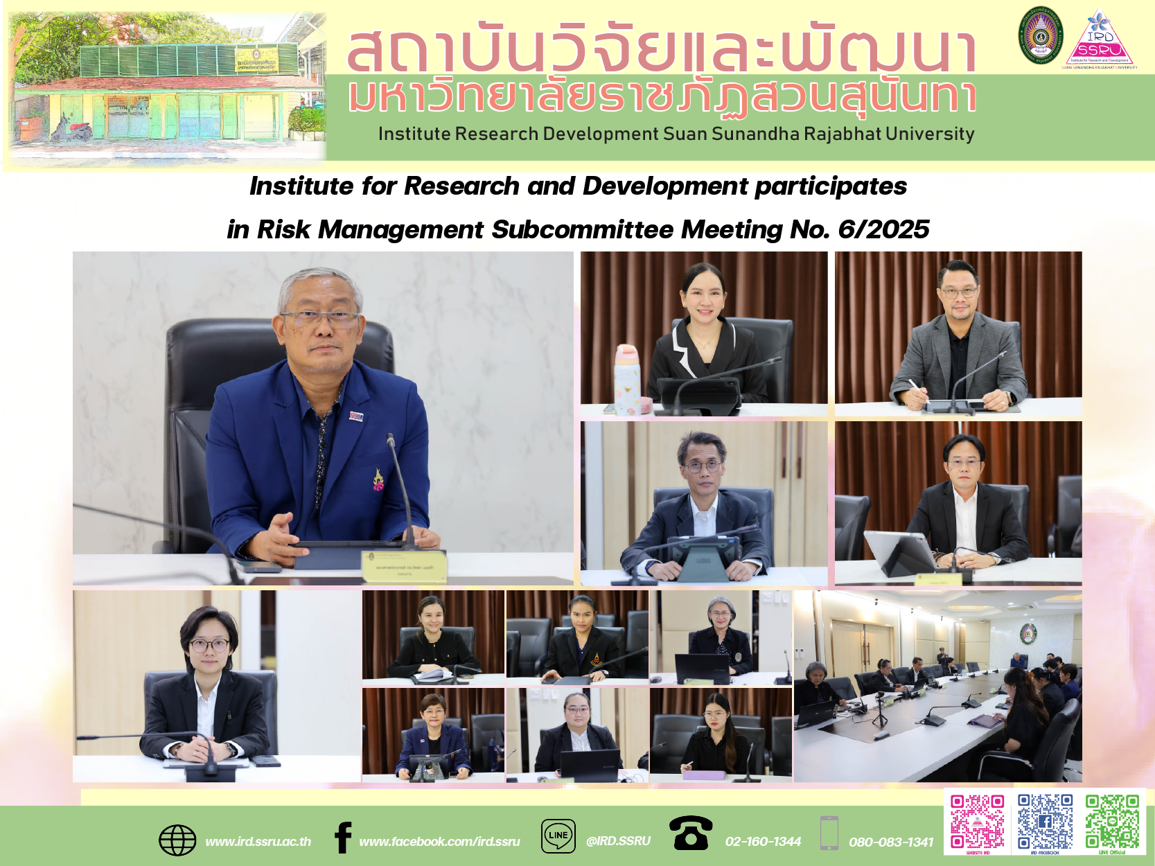 On 6 November 2025, the Institute for Research and Development (IRD), Suan Sunandha Rajabhat University, joined the University’s Risk Management Subcommittee Meeting No. 6/2025. Asst. Prof. Dr. Morakot Worachairungreung, Director of IRD, assigned Dr. Duangjai Limsaksri, Deputy Director for Administration, to attend the meeting in order to consider effective risk-management approaches aligned with the University’s sustainable development strategy.