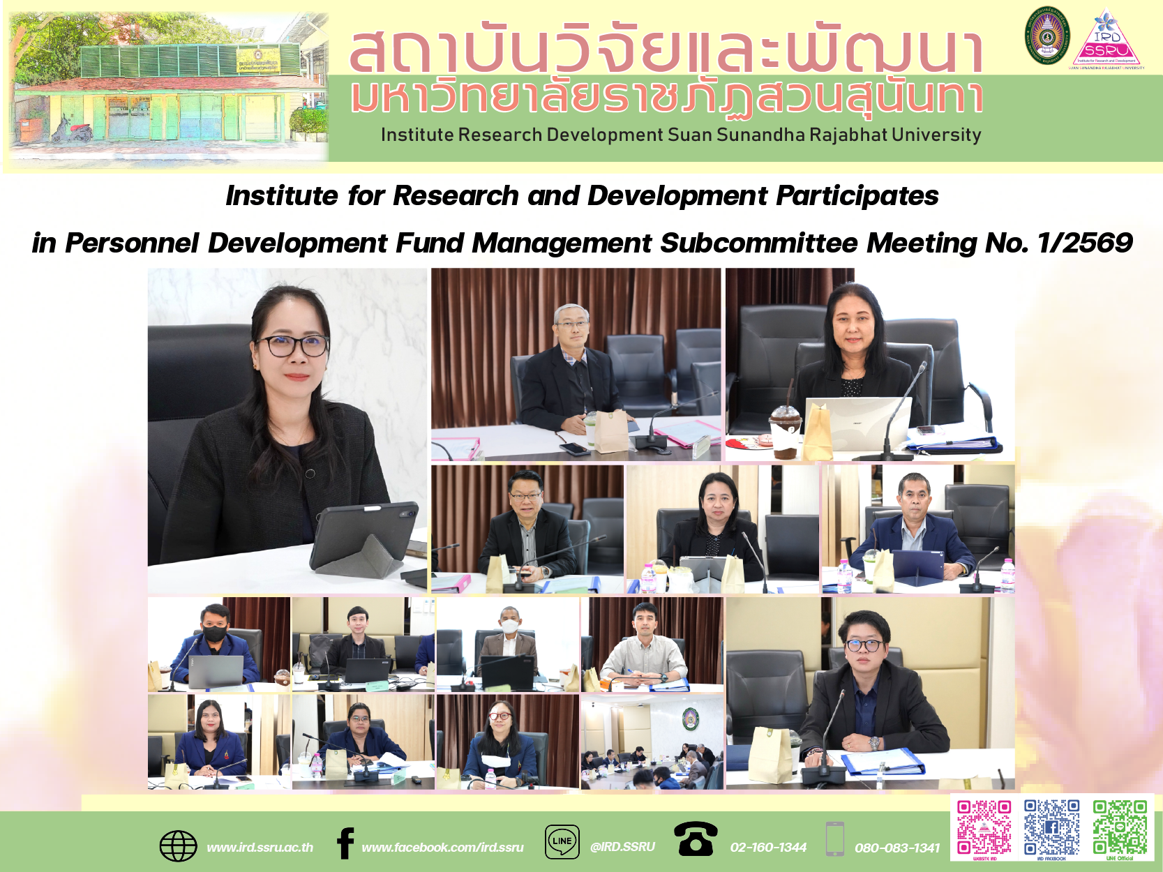On 8 January 2026 at 1:30 p.m., the Institute for Research and Development, Suan Sunandha Rajabhat University (SSRU), participated in the Personnel Development Fund Management Subcommittee Meeting No. 1/2569 at the Office of the President meeting room. The meeting was chaired by Assoc. Prof. Dr. Rosjana Chandhasa, Vice-President for Research and Development, to consider key matters including proposals for publication incentive awards for articles published in national and international academic journals, research article citation awards, outstanding research awards, and related issues aimed at enhancing the quality of the university’s academic outputs.