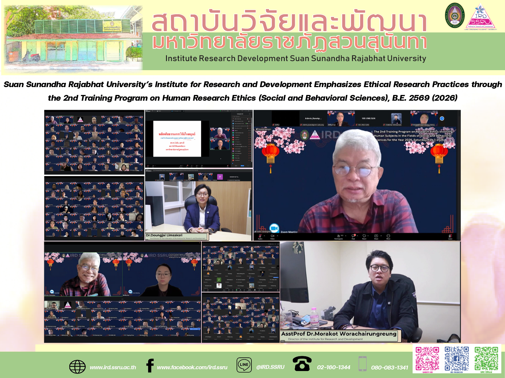 On 7 February B.E. 2569 (2026), from 9:00 a.m. to 4:00 p.m., the Institute for Research and Development, Suan Sunandha Rajabhat University, organized the 2nd Training Program on Human Research Ethics (Social and Behavioral Sciences) for B.E. 2569 (2026) in an online format via ZOOM Cloud Meeting. The program aimed to strengthen knowledge and understanding of research ethics among faculty members, researchers, students, and relevant stakeholders—serving as an essential pathway to enhancing research quality in line with international standards.
