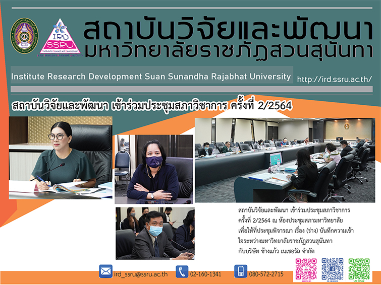 วันนี้ (10 ก.พ. 64) เวลา 10.45 น. ผู้ช่วยศาสตราจารย์ ดร.รจนา จันทราสา ผู้อำนวยการสถาบันวิจัยและพัฒนา พร้อมด้วย อาจารย์ ดร.ปกครอง มณีโรจน์ รองผู้อำนวยการฝ่ายวิจัยและพัฒนา นางสาวพรทิพย์ เรืองปราชญ์ หัวหน้าสำนักงานสถาบันวิจัยและพัฒนา และนางสาวสรวงสุดา ทรัพย์เจริญ เจ้าหน้าที่บริหารงานทั่วไป เข้าร่วมประชุมสภาวิชาการ ครั้งที่ 2/2564 ณ ห้องประชุมสภามหาวิทยาลัย อาคาร 31 ชั้น 5 โดยมี รองศาสตราจารย์ ดร.ชุติกาญจน์ ศรีวิบูลย์ อธิการบดี เป็นประธานการประชุม ในการประชุมครั้งนี้ สถาบันวิจัยและพัฒนาได้มีวาระเพื่อให้ที่ประชุมพิจารณา เรื่อง (ร่าง) บันทึกความเข้าใจระหว่างมหาวิทยาลัยราชภัฏสวนสุนันทา กับบริษัท ช้างแก้ว เนเชอรัล จำกัด นำเสนอโดย อาจารย์ ดร.ปกครอง มณีโรจน์ รองผู้อำนวยการฝ่ายวิจัยและพัฒนา