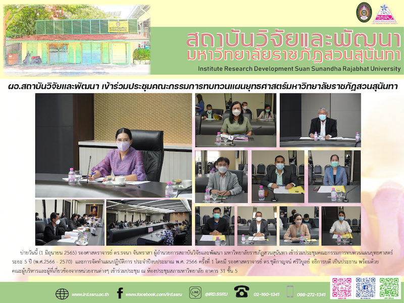 บ่ายวันนี้ (1 มิถุนายน 2565) รองศาสตราจารย์ ดร.รจนา จันทราสา ผู้อำนวยการสถาบันวิจัยและพัฒนา มหาวิทยาลัยราชภัฏสวนสุนันทา เข้าร่วมประชุมคณะกรรมการทบทวนแผนยุทธศาสตร์ ระยะ 5 ปี (พ.ศ.2566 - 2570) และการจัดทำแผนปฏิบัติการ ประจำปีงบประมาณ พ.ศ. 2566 ครั้งที่ 1 โดยมี รองศาสตราจารย์ ดร.ชุติกาญจน์ ศรีวิบูลย์ อธิการบดี เป็นประธาน พร้อมด้วยคณะผู้บริหารและผู้ที่เกี่ยวข้องจากหน่วยงานต่างๆ เข้าร่วมประชุม ณ ห้องประชุมสภามหาวิทยาลัย อาคาร 31 ชั้น 5