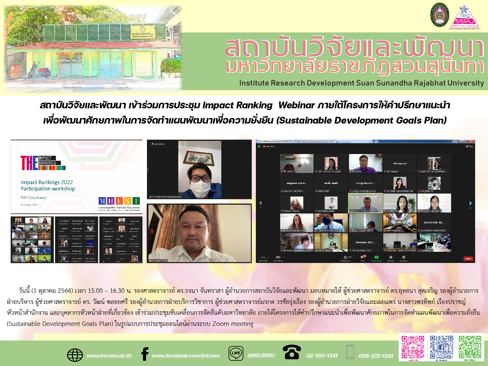 สถาบันวิจัยและพัฒนา เข้าร่วมการประชุม Impact Ranking Webinar ภายใต้โครงการให้คำปรึกษาแนะนำเพื่อพัฒนาศักยภาพในการจัดทำแผนพัฒนาเพื่อความยั่งยืน (Sustainable Development Goals Plan)