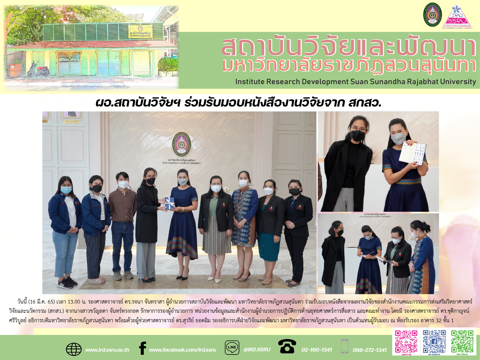 วันนี้ (16 มี.ค. 65) เวลา 13.00 น. รองศาสตราจารย์ ดร.รจนา จันทราสา ผู้อำนวยการสถาบันวิจัยและพัฒนา มหาวิทยาลัยราชภัฏสวนสุนันทา ร่วมรับมอบหนังสือจากผลงานวิจัยของสำนักงานคณะกรรมการส่งเสริมวิทยาศาสตร์ วิจัยและนวัตกรรม (สกสว.) จากนางสาวขวัญลดา จันทร์ทรงกลด รักษาการรองผู้อำนวยการ หน่วยงานข้อมูลและสำนักงานผู้อำนวยการปฏิบัติการด้านยุทธศาสตร์การสื่อสาร และคณะทำงาน โดยมี รองศาสตราจารย์ ดร.ชุติกาญจน์ ศรีวิบูลย์ อธิการบดีมหาวิทยาลัยราชภัฏสวนสุนันทา พร้อมด้วยผู้ช่วยศาสตราจารย์ ดร.สุวรีย์ ยอดฉิม รองอธิการบดีฝ่ายวิจัยและพัฒนา มหาวิทยาลัยราชภัฏสวนสุนันทา เป็นตัวแทนผู้รับมอบ ณ ห้องรับรอง อาคาร 32 ชั้น 1