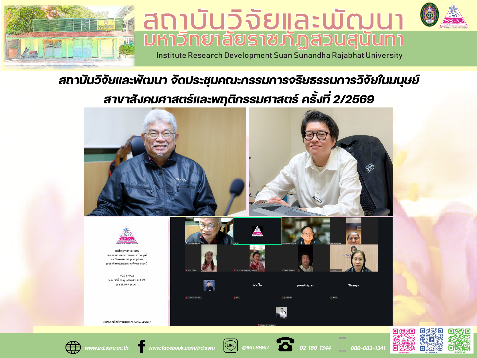 วันที่ 16 กุมภาพันธ์ พ.ศ. 2569 เวลา 17.00 – 18.30 น. สถาบันวิจัยและพัฒนา มหาวิทยาลัยราชภัฏสวนสุนันทา จัดประชุมคณะกรรมการจริยธรรมการวิจัยในมนุษย์ สาขาสังคมศาสตร์และพฤติกรรมศาสตร์ ครั้งที่ 2/2569 เพื่อพิจารณารับรองโครงการวิจัยและติดตามความก้าวหน้าในการดำเนินงานด้านจริยธรรมการวิจัยให้เป็นไปตามมาตรฐานสากล โดยมี รองศาสตราจารย์ ดร.โยธิน แสวงดี เป็นประธาน พร้อมด้วย ผู้ช่วยศาสตราจารย์ ดร.มรกต วรชัยรุ่งเรือง ผู้อำนวยการสถาบันวิจัยและพัฒนา อาจารย์ ดร.ดวงใจ ลิ้มศักดิ์ศรี รองผู้อำนวยการฝ่ายบริหาร และคณะกรรมการที่เกี่ยวข้อง เข้าร่วมประชุมในรูปแบบออนไลน์ผ่านระบบ Zoom Meeting