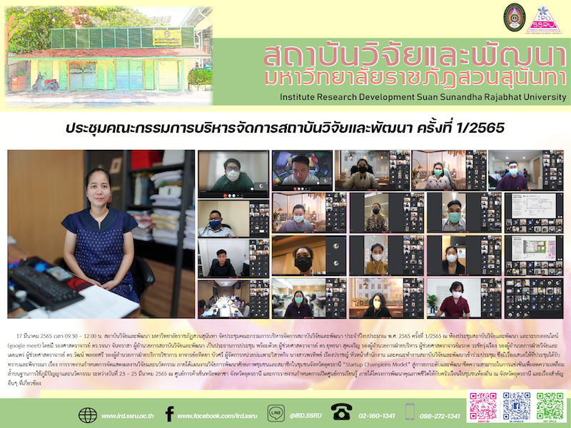17 มีนาคม 2565 เวลา 09.30 – 12.00 น. สถาบันวิจัยและพัฒนา มหาวิทยาลัยราชภัฏสวนสุนันทา จัดประชุมคณะกรรมการบริหารจัดการสถาบันวิจัยและพัฒนา ประจำปีงบประมาณ พ.ศ. 2565 ครั้งที่ 1/2565 ณ ห้องประชุมสถาบันวิจัยและพัฒนา และระบบออนไลน์ (google meet) โดยมี รองศาสตราจารย์ ดร.รจนา จันทราสา ผู้อำนวยการสถาบันวิจัยและพัฒนา เป็นประธานการประชุม พร้อมด้วย ผู้ช่วยศาสตราจารย์ ดร.ยุทธนา สุดเจริญ รองผู้อำนวยการฝ่ายบริหาร ผู้ช่วยศาสตราจารย์มรกต วรชัยรุ่งเรือง รองผู้อำนวยการฝ่ายวิจัยและเผยแพร่ ผู้ช่วยศาสตราจารย์ ดร.วัฒน์ พลอยศรี รองผู้อำนวยการฝ่ายบริการวิชาการ อาจารย์อทิตยา บัวศรี ผู้จัดการหน่วยบ่มเพาะวิสาหกิจ นางสาวพรทิพย์ เรืองปราชญ์ หัวหน้าสำนักงาน และคณะทำงานสถาบันวิจัยและพัฒนาเข้าร่วมประชุม ซึ่งมีเรื่องเสนอให้ที่ประชุมได้รับทราบและพิจารณา เรื่อง การรายงานกำหนดการจัดแสดงผลงานวิจัยและนวัตกรรม ภายใต้แผนงานวิจัยการพัฒนาศักยภาพชุมชนและสมาชิกในชุมชนจังหวัดอุดรธานี “Startup Champions Model” สู่การยกระดับและพัฒนาขีดความสามารถในการแข่งขันเพื่อลดความเหลื่อมล้ำบนฐานการใช้ภูมิปัญญาและนวัตกรรม ระหว่างวันที่ 23 – 25 มีนาคม 2565 ณ ศูนย์การค้าเซ็นทรัลพลาซา จังหวัดอุดรธานี และการรายงานกำหนดการเปิดศูนย์การเรียนรู้ ภายใต้โครงการพัฒนาคุณภาพชีวิตให้กับครัวเรือนในชุมชนท้องถิ่น ณ จังหวัดอุดรธานี และเรื่องสำคัญอื่นๆ ที่เกี่ยวข้อง