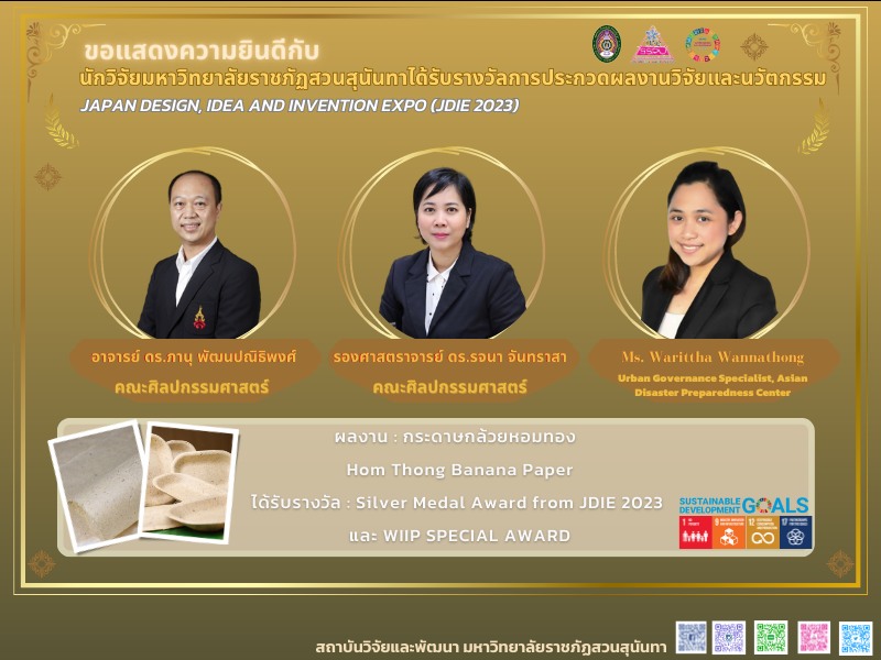 อาจารย์ ดร.ภานุ พัฒนปณิธิพงศ์ รองศาสตราจารย์ ดร.รจนา จันทราสา อาจารย์ประจำแขนงวิชาการออกแบบสินค้าไลฟ์สไตล์ สาขาวิชาการออกแบบแฟชั่นและสินค้าไลฟ์สไตล์ คณะศิลปกรรมศาสตร์ มหาวิทยาลัยราชภัฏสวนสุนันทา และMs.Warittha Wannathong, Urban Governance Specialist, Asian Disaster Preparedness Center นำผลงานวิจัย “กระดาษกล้วยหอมทอง : Hom Thong Banana Paper” ซึ่งได้รับการคัดเลือกจากสำนักงานการวิจัยแห่งชาติ (วช.) เข้าร่วมประกวดและจัดแสดงผลงาน เมื่อวันที่ 8 กรกฎาคม 2566 ณ Tokyo Ariake Garden Convention Center, Japan กรุงโตเกียว ประเทศญี่ปุ่น ผลงานปรากฏว่าทีมนักวิจัยของมหาวิทยาลัยราชภัฏสวนสุนันทาสามารถคว้ารางวัลเหรียญเงินและรางวัลพิเศษ (WIIP SPECIAL AWARD) ในเวที “Japan Design, Idea and Invention Expo” (JDIE 2023)