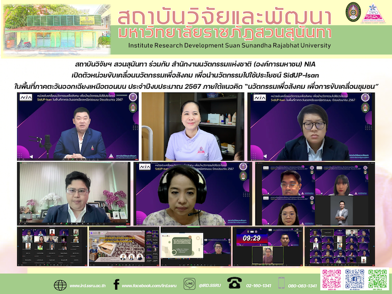 วันที่ 21 มีนาคม 2567 สถาบันวิจัยและพัฒนา มหาวิทยาลัยราชภัฏสวนสุนันทา ร่วมกับ สำนักงานนวัตกรรมแห่งชาติ (องค์การมหาชน) หรือ NIA จัดกิจกรรมเปิดตัวหน่วยขับเคลื่อนนวัตกรรมเพื่อสังคม เพื่อนำนวัตกรรมไปใช้ประโยชน์ SidUP-Isan ในพื้นที่ภาคตะวันออกเฉียงเหนือตอนบน ประจำปีงบประมาณ 2567 ภายใต้แนวคิด “นวัตกรรมเพื่อสังคม เพื่อการขับเคลื่อนชุมชน” เพื่อส่งเสริมและสนับสนุนการใช้ประโยชน์ผลงานวิจัยและนวัตกรรมเกี่ยวกับเทคโนโลยีที่เหมาะสมกับชุมชนหรือผู้ประกอบการในพื้นที่ และอบรมบ่มเพาะเพิ่มความสามารถด้านนวัตกรรมจนสามารถพัฒนา “ผลงานนวัตกรรมเพื่อสังคม” ในพื้นที่ที่มีผู้ได้รับประโยชน์ในพื้นที่เป้าหมายได้อย่างเป็นรูปธรรม โดยได้รับเกียรติจาก ดร.กริชผกา บุญเฟื่อง ผู้อำนวยการสำนักงานนวัตกรรมแห่งชาติ (องค์การมหาชน) NIA เป็นประธานในพิธีเปิดงาน และรองศาสตราจารย์ ดร.บัณฑิต ผังนิรันดร์ รองอธิการบดีฝ่ายวิจัยและพัฒนา กล่าวต้อนรับผู้เข้าร่วมกิจกรรม ทั้งนี้ รองศาสตราจารย์ ดร.รจนา จันทราสา ผู้อำนวยการสถาบันวิจัยและพัฒนา กล่าวรายงาน และผู้ช่วยศาสตราจารย์ ดร.มรกต วรชัยรุ่งเรือง รองผู้อำนวยการฝ่ายวิจัยและเผยแพร่ ชี้แจงการเลือกเทคโนโลยีที่สนใจให้กับชุมชนในครั้งนี้ นอกจากนี้ยังมีเจ้าของผลงานนวัตกรรมพร้อมใช้ สําหรับทุนนวัตกรรมเพื่อสังคม ไปใช้ประโยชนในพื้นที่ ประจําปี 2567 ที่ผ่านการคัดเลือก จำนวน 10 ผลงานนวัตกรรม นำเสนอผลงานนวัตกรรมให้กับชุมชนที่สนใจนำนวัตกรรมไปใช้ประโยชน์ จำนวน 39 กลุ่ม โดยจัดขึ้นผ่านโปรแกรมการประชุมออนไลน์ Zoom Meeting ซึ่งมีผู้ให้ความสนใจเข้าร่วมกว่า 60 ราย โดยสอดคล้องกับเป้าหมายการพัฒนาที่ยั่งยืน (SDGs) เป้าหมายที่ 8 ส่งเสริมการเจริญเติบโตทางเศรษฐกิจที่ต่อเนื่อง ครอบคลุม และยั่งยืน การจ้างงานเต็มที่และ มีผลิตภาพ และการมีงานที่มีคุณค่าสำหรับทุกคน ตลอดจนเป็นการสร้างความร่วมมือกับเครือข่ายภาคเอกชนที่จะเป็นส่วนสำคัญในการขับเคลื่อนสังคมให้ได้รับการพัฒนาอย่างยั่งยืน และสอดคล้องกับเป้าหมายที่ 17 การเสริมความเข้มแข็งให้แก่กลไกการดำเนินงานและฟื้นฟูสภาพหุ้นส่วนความร่วมมือระดับโลกสำหรับการพัฒนาที่ยั่งยืน