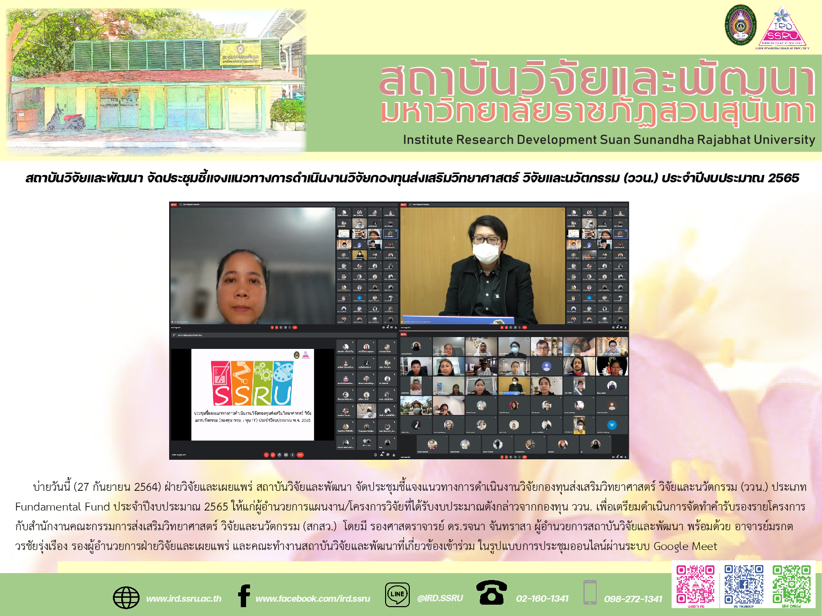บ่ายวันนี้ (27 กันยายน 2564) ฝ่ายวิจัยและเผยแพร่ สถาบันวิจัยและพัฒนา จัดประชุมชี้แจงแนวทางการดำเนินงานวิจัยกองทุนส่งเสริมวิทยาศาสตร์ วิจัยและนวัตกรรม (ววน.) ประเภท Fundamental Fund ประจำปีงบประมาณ 2565 ให้แก่ผู้อำนวยการแผนงาน/โครงการวิจัยที่ได้รับงบประมาณดังกล่าวจากกองทุน ววน. เพื่อเตรียมดำเนินการจัดทำคำรับรองรายโครงการกับสำนักงานคณะกรรมการส่งเสริมวิทยาศาสตร์ วิจัยและนวัตกรรม (สกสว.) โดยมี รองศาสตราจารย์ ดร.รจนา จันทราสา ผู้อำนวยการสถาบันวิจัยและพัฒนา พร้อมด้วย อาจารย์มรกต วรชัยรุ่งเรือง รองผู้อำนวยการฝ่ายวิจัยและเผยแพร่ และคณะทำงานสถาบันวิจัยและพัฒนาที่เกี่ยวข้องเข้าร่วม ในรูปแบบการประชุมออนไลน์ผ่านระบบ Google Meet