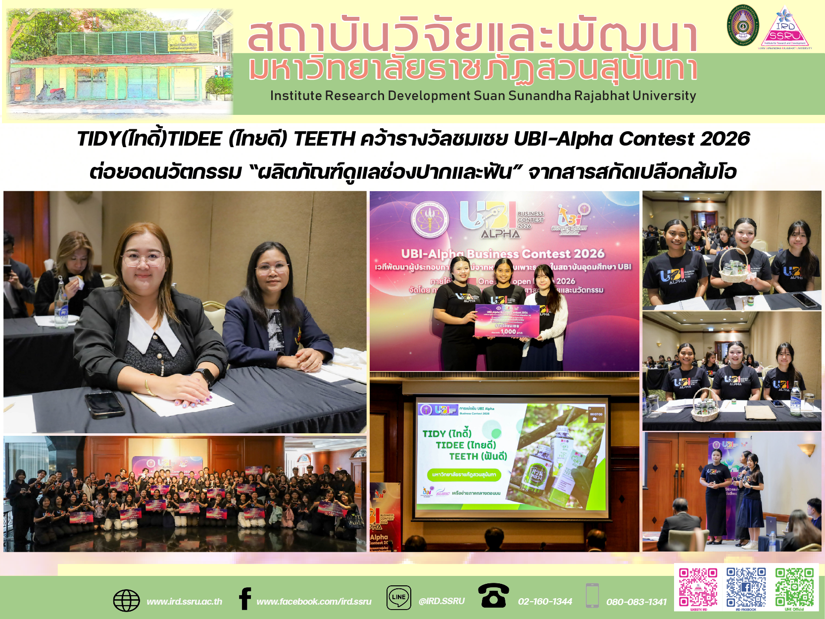 ขอแสดงความยินดีกับทีม Startup สวนสุนันทา ทีม TIDY(ไทดี้)TIDEE (ไทยดี) TEETH ที่คว้ารางวัล “ชมเชย” จากการแข่งขัน UBI-Alpha Contest 2026 เวทีพัฒนาผู้ประกอบการรุ่นใหม่จากหน่วยบ่มเพาะวิสาหกิจในสถาบันอุดมศึกษา (UBI) จัดโดย สำนักปลัดกระทรวงการอุดมศึกษา วิทยาศาสตร์ วิจัยและนวัตกรรม (สป.อว.) เพื่อส่งเสริมและบ่มเพาะให้นักศึกษาเป็นผู้ประกอบการรุ่นใหม่ในระดับภูมิภาค ภาคกลางและภาคตะวันออก ณ โรงแรมจูบิลี่ เพรสทีจ รัชดาภิเษก กรุงเทพมหานคร
