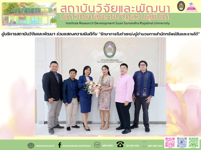 วันที่ 29 กันยายน 2566 สถาบันวิจัยและพัฒนา มหาวิทยาลัยราชภัฏสวนสุนันทา นำโดย รองศาสตราจารย์ ดร.บัณฑิต ผังนิรันดร์ รองอธิการบดีฝ่ายวิจัยและพัฒนา พร้อมด้วย รองศาสตราจารย์ ดร.รจนา จันทราสา ผู้อำนวยการสถาบันวิจัยและพัฒนา ผู้ช่วยศาสตราจารย์ ดร.วัฒน์ พลอยศรี รองผู้อำนวยการฝ่ายบริการวิชาการ ผู้ช่วยศาสตราจารย์ ดร.มรกต วรชัยรุ่งเรือง รองผู้อำนวยการฝ่ายวิจัยและเผยแพร่ อาจารย์อทิตยา บัวศรี ผู้จัดการหน่วยบ่มเพาะวิสาหกิจ มอบกระเช้าดอกไม้แสดงความยินดี กับอาจารย์นภัสกร ทรัพย์เฟื่องฟู ในโอกาสได้รับการแต่งตั้งให้ดำรงตำแหน่ง รักษาการในตำแหน่งผู้อำนวยการสำนักทรัพย์สินและรายได้ มหาวิทยาลัยราชภัฏสวนสุนันทา ณ ห้องรับรอง สำนักงานอธิการบดี มหาวิทยาลัยราชภัฏสวนสุนันทา