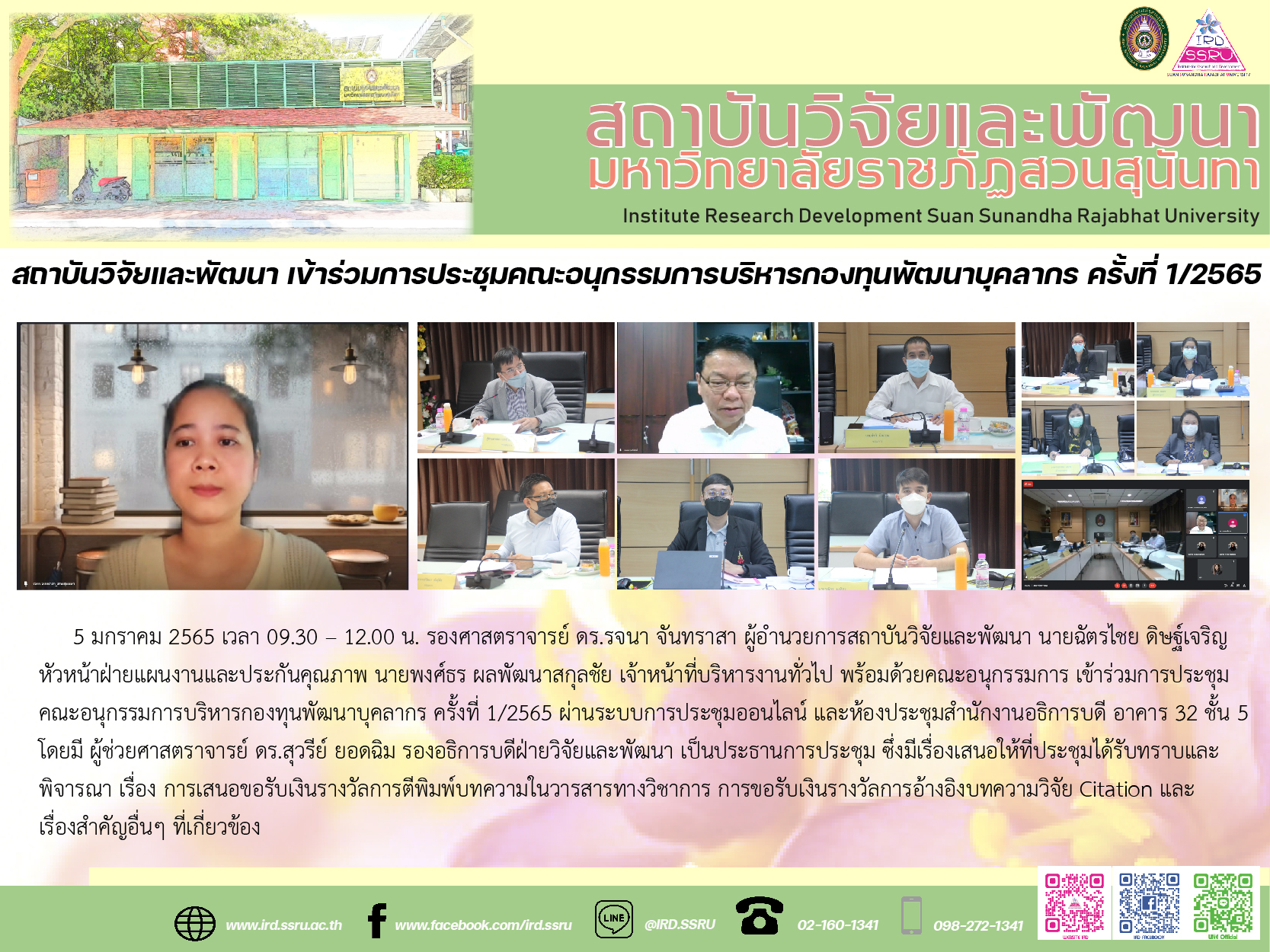 5 มกราคม 2565 เวลา 09.30 – 12.00 น. รองศาสตราจารย์ ดร.รจนา จันทราสา ผู้อำนวยการสถาบันวิจัยและพัฒนา นายฉัตรไชย ดิษฐ์เจริญ หัวหน้าฝ่ายแผนงานและประกันคุณภาพ นายพงศ์ธร ผลพัฒนาสกุลชัย เจ้าหน้าที่บริหารงานทั่วไป พร้อมด้วยคณะอนุกรรมการ เข้าร่วมการประชุมคณะอนุกรรมการบริหารกองทุนพัฒนาบุคลากร ครั้งที่ 1/2565 ผ่านระบบการประชุมออนไลน์ และห้องประชุมสำนักงานอธิการบดี อาคาร 32 ชั้น 5 โดยมี ผู้ช่วยศาสตราจารย์ ดร.สุวรีย์ ยอดฉิม รองอธิการบดีฝ่ายวิจัยและพัฒนา เป็นประธานการประชุม ซึ่งมีเรื่องเสนอให้ที่ประชุมได้รับทราบและพิจารณา เรื่อง การเสนอขอรับเงินรางวัลการตีพิมพ์บทความในวารสารทางวิชาการ การขอรับเงินรางวัลการอ้างอิงบทความวิจัย Citation และเรื่องสำคัญอื่นๆ ที่เกี่ยวข้อง