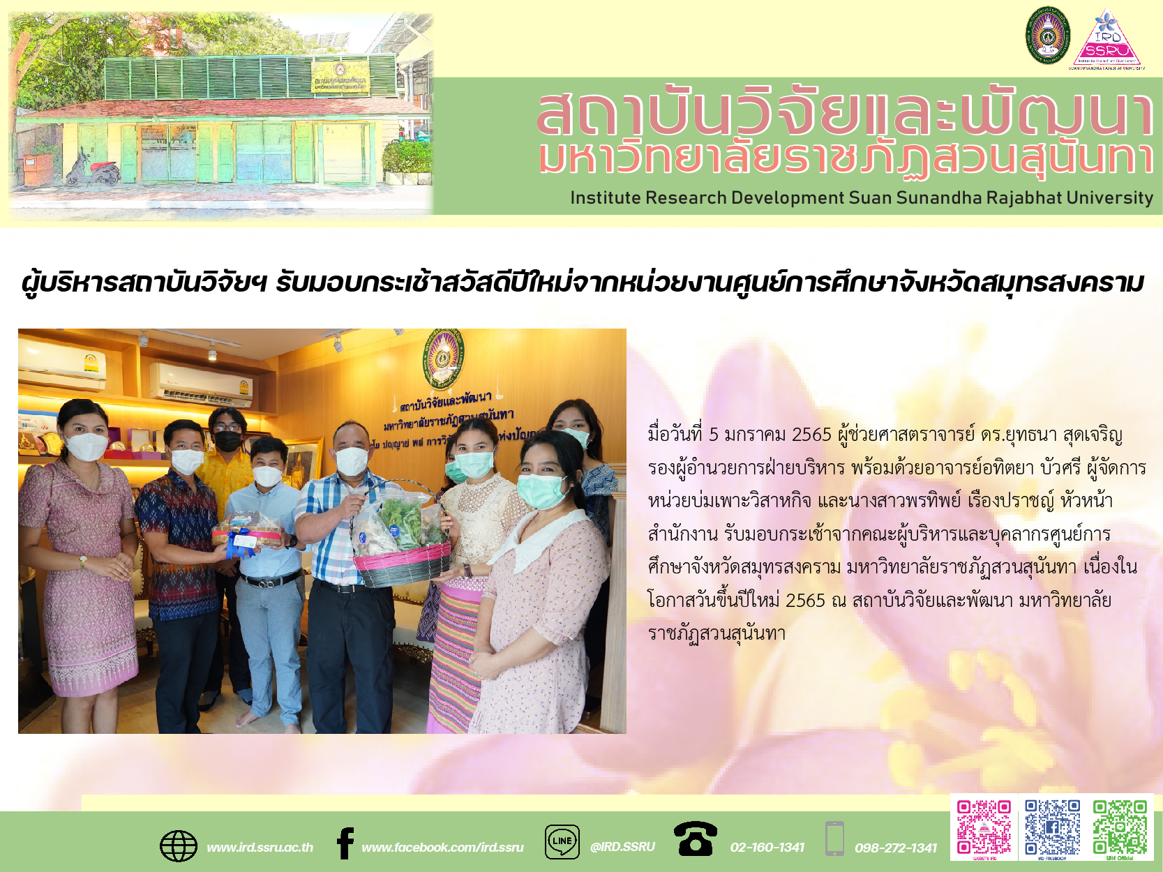 เมื่อวันที่ 5 มกราคม 2565 ผู้ช่วยศาสตราจารย์ ดร.ยุทธนา สุดเจริญ รองผู้อำนวยการฝ่ายบริหาร พร้อมด้วยอาจารย์อทิตยา บัวศรี ผู้จัดการหน่วยบ่มเพาะวิสาหกิจ และนางสาวพรทิพย์ เรืองปราชญ์ หัวหน้าสำนักงาน รับมอบกระเช้าจากคณะผู้บริหารและบุคลากรศูนย์การศึกษาจังหวัดสมุทรสงคราม มหาวิทยาลัยราชภัฏสวนสุนันทา เนื่องในโอกาสวันขึ้นปีใหม่ 2565 ณ สถาบันวิจัยและพัฒนา มหาวิทยาลัยราชภัฏสวนสุนันทา