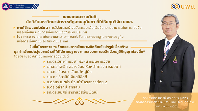 สถาบันวิจัยและพัฒนา ขอแสดงความยินดี นักวิจัยมหาวิทยาลัยราชภัฏสวนสุนันทา ที่ได้รับทุนวิจัย บพข.