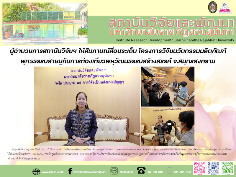 วันศุกร์ที่ 8 กรกฎาคม 2565 เวลา 10.30 น. ณ สถาบันวิจัยและพัฒนา มหาวิทยาลัยราชภัฏสวนสุนันทา รองศาสตราจารย์ ดร.รจนา จันทราสา ผู้อำนวยการสถาบันวิจัยและพัฒนา มหาวิทยาลัยราชภัฏสวนสุนันทา บันทึกเทปให้สัมภาษณ์สื่อรายการ Talk Today (ทอล์กทูเดย์) ออกอากาศทางช่อง PPTV HD 36 ในประเด็นการขับเคลื่อนผลิตภัณฑ์กุหลาบอธิษฐาน จากโครงการวิจัยนวัตกรรมผลิตภัณฑ์พุทธธรรมสายมูกับการท่องเที่ยวพหุวัฒนธรรมสร้างสรรค์ จังหวัดสมุทรสงคราม