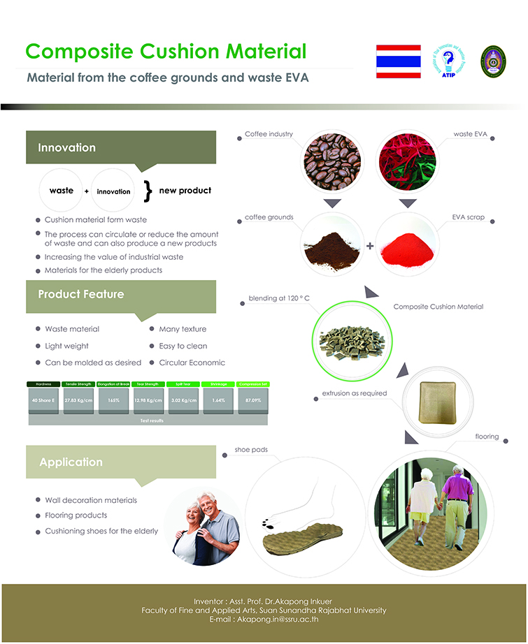 1. ผลงานเรื่อง : Composite Cushion Material from the coffee grounds and waste EVA -Ethylene vinyl acetate