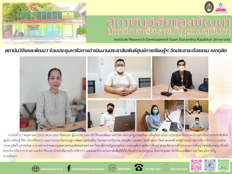 บ่ายวันนี้ (11 พฤษภาคม 2565) รศ.ดร.รจนา จันทราสา ผู้อำนวยการสถาบันวิจัยและพัฒนา มหาวิทยาลัยราชภัฏสวนสุนันทา เป็นประธานในการประชุมหารือแนวทางการดำเนินงานประชาสัมพันธ์ศูนย์การเรียนรู้ วิจัย บริการวิชาการ และถ่ายทอดนวัตกรรมสู่การพัฒนาชุมชนเมือง วัดประชาระบือธรรม เขตดุสิต กรุงเทพฯ โดยมี ผศ.ดร.วัฒน์ พลอยศรี รองผู้อำนวยการฝ่ายบริการวิชาการ ร่วมด้วย รศ.ดร.ภูสิทธิ์ ภูคำชะโนด อาจารย์ประจำคณะมนุษยศาสตร์และสังคมศาสตร์ มหาวิทยาลัยราชภัฏสวนสุนันทา นายอนุพันธ์ สุทธิมาร หัวหน้าฝ่ายบริหารงานทั่วไป นางสาวธนัญญา ศานติธรรมกุล หัวหน้าฝ่ายบริการวิชาการ นางสาวเจนจิรา ชินวงษ์ เจ้าหน้าที่ฝ่ายบริการวิชาการ และคณะทำงานประชาสัมพันธ์ที่เกี่ยวข้องเข้าร่วมประชุม ณ ห้องประชุมสถาบันวิจัยและพัฒนา มหาวิทยาลัยราชภัฏสวนสุนันทา