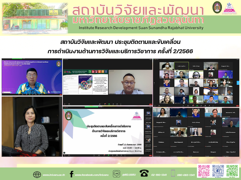 วันพุธที่ 13 กันยายน 2566 เวลา 10.00 – 12.00 น. สถาบันวิจัยและพัฒนา มหาวิทยาลัยราชภัฏสวนสุนันทา ในฐานะหน่วยงานเจ้าภาพกำกับดูแลตัวชี้วัดด้านการวิจัยและบริการวิชาการ ประชุมติดตามและขับเคลื่อนการดำเนินงานด้านการวิจัยและบริการวิชาการ ครั้งที่ 2/2566 เพื่อให้การดำเนินงานตัวชี้วัดด้านการวิจัยและบริการวิชาการบรรลุเป้าหมาย โดยในการประชุมได้รับเกียรติจาก รองศาสตราจารย์ ดร.บัณฑิต ผังนิรันดร์ รองอธิการบดีฝ่ายวิจัยและพัฒนา เป็นประธานในการประชุม พร้อมด้วย รองศาสตราจารย์ ดร.รจนา จันทราสา ผู้อำนวยการสถาบันวิจัยและพัฒนา ผู้ช่วยศาสตราจารย์ ดร.ยุทธนา สุดเจริญ รองผู้อำนวยการฝ่ายบริหาร ผู้ช่วยศาสตราจารย์ ดร.มรกต วรชัยรุ่งเรือง รองผู้อำนวยการฝ่ายวิจัยและเผยแพร่ ผู้ช่วยศาสตราจารย์ ดร.วัฒน์ พลอยศรี รองผู้อำนวยการฝ่ายบริการวิชาการ อาจารย์อทิตยา บัวศรี ผู้จัดการหน่วยบ่มเพาะวิสาหกิจ นางสาวพรทิพย์ เรืองปราชญ์ หัวหน้าสำนักงาน และคณะทำงานสถาบันวิจัยและพัฒนาร่วมขับเคลื่อนการดำเนินงานตัวชี้วัดการปฏิบัติราชการ (กพร.) ประจำปีงบประมาณ พ.ศ. 2566 รอบ 12 เดือน และชี้แจงแนวทางการดำเนินงานในปีงบประมาณ พ.ศ. 2567 ซึ่งมีผู้บริหารหน่วยงานและบุคลากรที่เกี่ยวข้องเข้าร่วมประชุมในรูปแบบการประชุมออนไลน์ Zoom Meeting