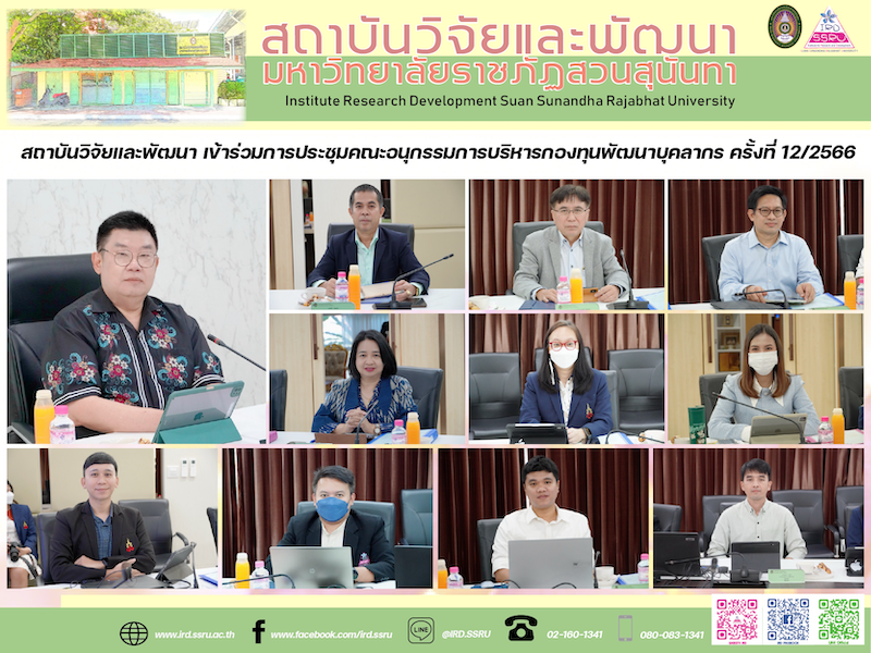 เมื่อวันที่ 13 ธันวาคม 2566 เวลา 09.30 น. นายอนุพันธ์ สุทธิมาร หัวหน้าฝ่ายบริหารงานทั่วไป และนายฉัตรไชย ดิษฐ์เจริญ หัวหน้าฝ่ายแผนงานและประกันคุณภาพ เข้าร่วมการประชุมคณะอนุกรรมการบริหารกองทุนพัฒนาบุคลากร ครั้งที่ 12/2566 ณ ห้องประชุมสำนักงานอธิการบดี ชั้น 5 อาคาร 32 มหาวิทยาลัยราชภัฏสวนสุนันทา โดยมี รองศาสตราจารย์ ดร.บัณฑิต ผังนิรันดร์ รองอธิการบดีฝ่ายวิจัยและพัฒนา เป็นประธานการประชุม พร้อมด้วยคณะอนุกรรมการเข้าร่วม ซึ่งมีวัตถุประสงค์เพื่อพิจารณาการเสนอขอรับเงินรางวัลของบุคลากรมหาวิทยาลัยราชภัฏสวนสุนันทา
