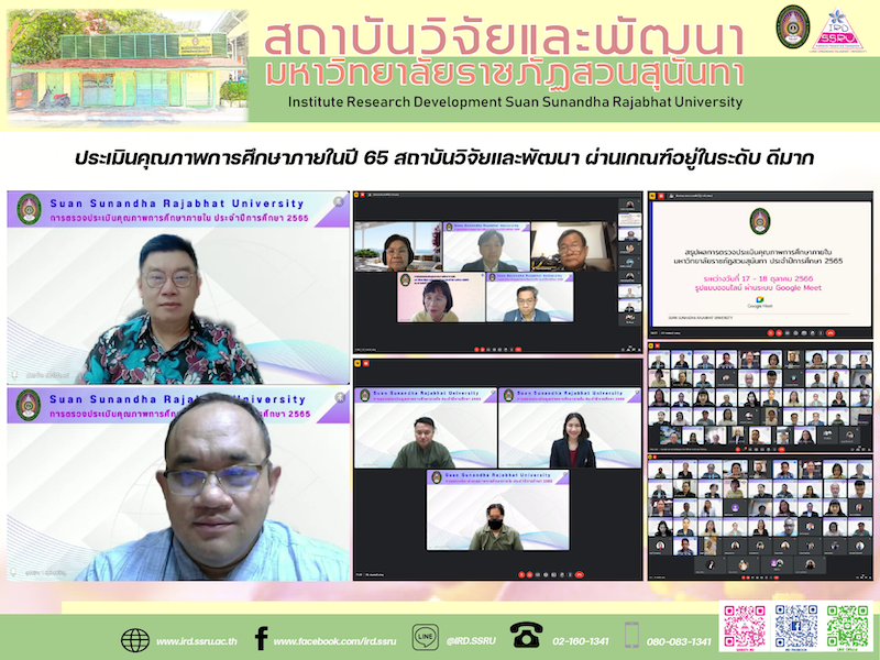 วันพุธที่ 18 ตุลาคม 2566 เวลา 11.00 น. สถาบันวิจัยและพัฒนา มหาวิทยาลัยราชภัฏสวนสุนันทา โดย รองศาสตราจารย์ ดร.บัณฑิต ผังนิรันดร์ รองอธิการบดีฝ่ายวิจัยและพัฒนา พร้อมด้วย ผู้ช่วยศาสตราจารย์ ดร.ยุทธนา สุดเจริญ รองผู้อำนวยการฝ่ายบริหาร ผู้ช่วยศาสตราจารย์ ดร.มรกต วรชัยรุ่งเรือง รองผู้อำนวยการฝ่ายวิจัยและเผยแพร่ ผู้ช่วยศาสตราจารย์ ดร.วัฒน์ พลอยศรี รองผู้อำนวยการฝ่ายบริการวิชาการ อาจารย์อทิตยา บัวศรี ผู้จัดการหน่วยบ่มเพาะวิสาหกิจ หัวหน้าฝ่าย และบุคลากรที่เกี่ยวข้อง ร่วมรับฟังการสรุปผลการตรวจประเมินคุณภาพการศึกษาภายใน มหาวิทยาลัยราชภัฏสวนสุนันทา ประจำปีการศึกษา 2565 ในรูปแบบการประชุมออนไลน์ โดยมี รองศาสตราจารย์ ดร.นันทิยา น้อยจันทร์ รองอธิการบดีฝ่ายวิชาการ เป็นประธาน ทั้งนี้ ได้รับเกียรติจาก รองศาสตราจารย์ ดร.ไทย ทิพย์สุวรรณกุล เป็นประธานในการตรวจประเมินฯ ร่วมด้วย รองศาสตราจารย์จันทนี เพชรานนท์ ผู้ช่วยศาสตราจารย์ ดร.ตวงรักษ์ นันทวิสารกุล ดร.ฐิติเดช ลือตระกูล และผู้ช่วยศาสตราจารย์ ดร.ชุมพล รอดแจ่ม เป็นคณะกรรมการผู้ทรงคุณวุฒิ