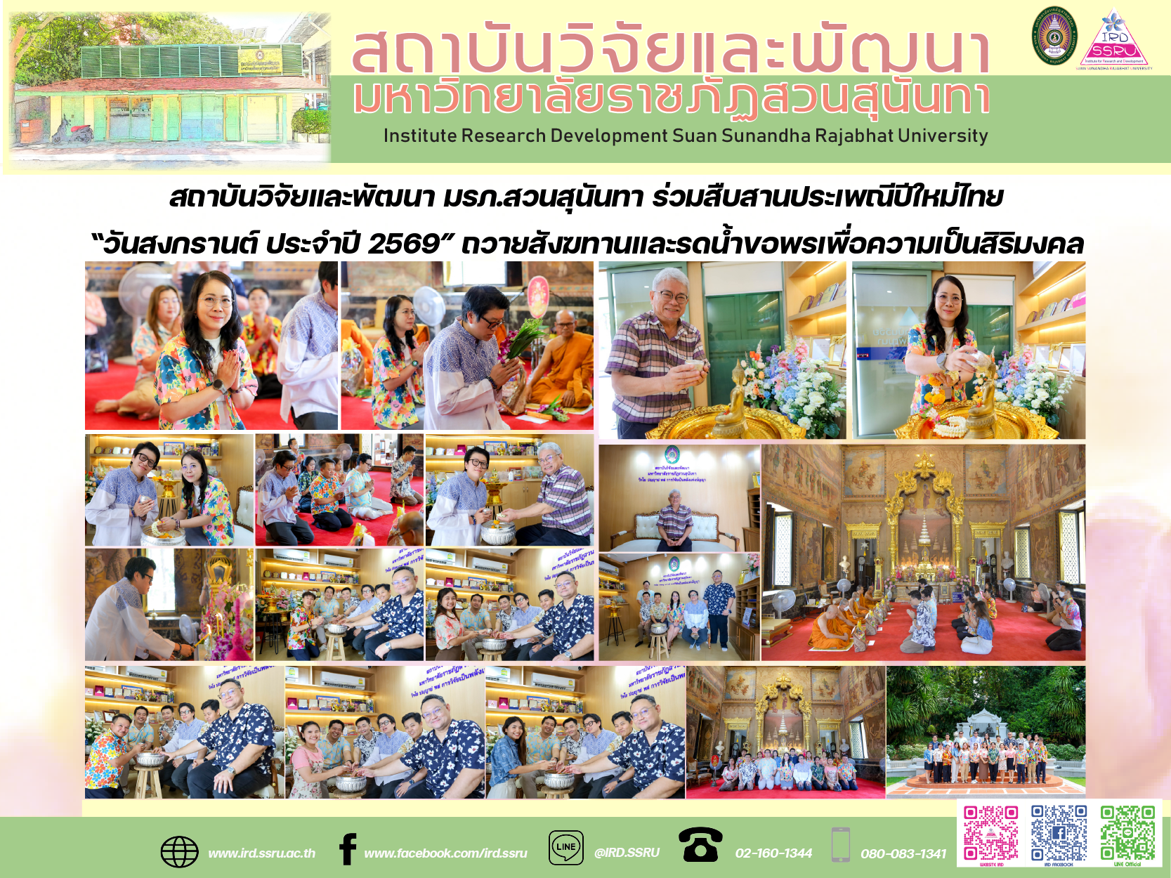 วันที่ 20 เมษายน 2569 รองศาสตราจารย์ ดร.รจนา จันทราสา รองอธิการบดีฝ่ายวิจัยและพัฒนา พร้อมด้วย ผู้ช่วยศาสตราจารย์ ดร.มรกต วรชัยรุ่งเรือง ผู้อำนวยการสถาบันวิจัยและพัฒนา คณะผู้บริหาร และบุคลากรในสังกัดสถาบันวิจัยและพัฒนา มหาวิทยาลัยราชภัฏสวนสุนันทา ร่วมสืบสานประเพณีอันดีงามของไทย เนื่องในโอกาสวันขึ้นปีใหม่ไทย “วันสงกรานต์ ประจำปี 2569” โดยได้ร่วมถวายสังฆทาน ณ วัดราชาธิวาสราชวรวิหาร เพื่อความเป็นสิริมงคลแก่ตนเองและหน่วยงาน