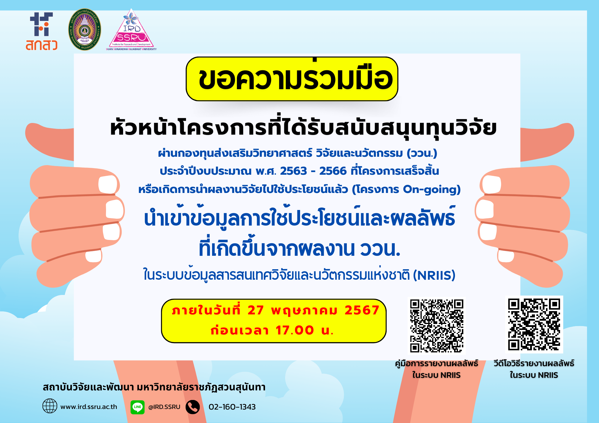 ภายในวันที่ 27 พฤษภาคม 2567 (ก่อนเวลา 17.00 น.)สามารถศึกษาคู่มือและสื่อวิดีโอการรายงานผลลัพธ์ในระบบ NRIIS ที่ QR code