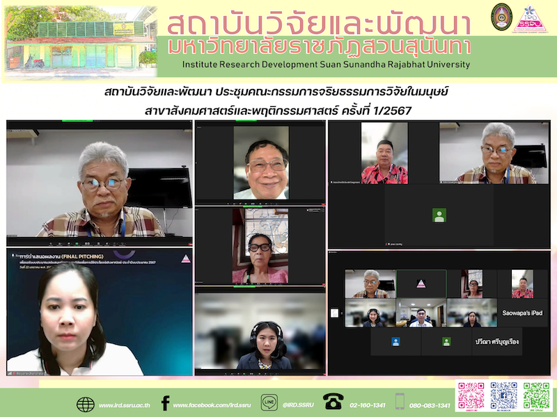 วันที่ 22 มกราคม 2567 เวลา 16.00 น. สถาบันวิจัยและพัฒนา มหาวิทยาลัยราชภัฏสวนสุนันทา ประชุมคณะกรรมการจริยธรรมการวิจัยในมนุษย์ สาขาสังคมศาสตร์และพฤติกรรมศาสตร์ ครั้งที่ 1/2567 ในรูปแบบออนไลน์ผ่านระบบ Zoom Meeting โดยมี รองศาสตราจารย์ ดร.โยธิน แสวงดี เป็นประธาน พร้อมด้วย รองศาสตราจารย์ ดร.บัณฑิต ผังนิรันดร์ รองอธิการบดีฝ่ายวิจัยและพัฒนา รองศาสตราจารย์ ดร.รจนา จันทราสา ผู้อำนวยการสถาบันวิจัยและพัฒนา ผู้ช่วยศาสตราจารย์ ดร.ยุทธนา สุดเจริญ รองผู้อำนวยการฝ่ายบริหาร ศาสตราจารย์ ดร.รวีวรรณ ชินะตระกูล รองศาสตราจารย์ ดร.ยงยุทธ แฉล้มวงษ์ รองศาสตราจารย์เสาวภา ไพทยวัฒน์ อาจารย์ชลลดา ชูวณิชชานนท์ คณะกรรมการ และคณะทำงานที่เกี่ยวข้องเข้าร่วมประชุม โดยในการประชุมดังกล่าวมีวาระการประชุมเรื่องรายงานสรุปโครงการวิจัยที่ได้รับรองจริยธรรมการวิจัยในมนุษย์ ประจำปีงบประมาณ พ.ศ. 2566 และรายงานผลการรับรองโครงการวิจัยแบบพิจารณาแบบเร็ว (Expedited)