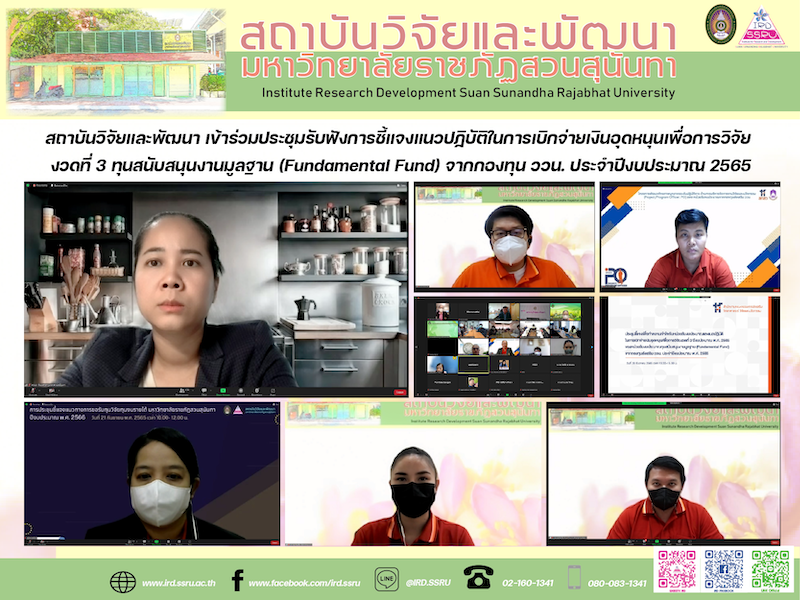 บ่ายวันนี้ (20 ธันวาคม 2565) รศ.ดร.รจนา จันทราสา ผู้อำนวยการสถาบันวิจัยและพัฒนา มหาวิทยาลัยราชภัฏสวนสุนันทา ร่วมด้วย ผศ.มรกต วรชัยรุ่งเรือง รองผู้อำนวยการฝ่ายวิจัยและเผยแพร่ อาจารย์อทิตยา บัวศรี ผู้จัดการหน่วยบ่มเพาะวิสาหกิจ นางสาวพรทิพย์ เรืองปราชญ์ หัวหน้าสำนักงาน นางสาวชุติมา ธีรสุวรรณ หัวหน้าฝ่ายวิจัยและเผยแพร่ และนายอนุพันธ์ สุทธิมาร หัวหน้าฝ่ายบริหารงานทั่วไป เข้าร่วมประชุมรับฟังการชี้แจงแนวทางปฏิบัติในการเบิกจ่ายเงินอุดหนุนเพื่อการวิจัย งวดที่ 3 ปีงบประมาณ 2565 ของหน่วยรับงบประมาณทุนสนับสนุนงานมูลฐาน (Fundamental Fund) จากกองทุนส่งเสริม ววน. ประจำปีงบประมาณ 2565 จัดโดย สำนักงานคณะกรรมการส่งเสริมวิทยาศาสตร์ วิจัยและนวัตกรรม (สกสว.) โดยมี รศ.ดร.ปัทมาวดี โพชนุกูล ผู้อำนวยการ สกสว. และรศ.ดร.อภิศักดิ์ ธีระวิสิษฐ์ รองผู้อำนวยการ สกสว. กล่าวชี้แจงในรูปแบบการประชุมออนไลน์ ผ่านระบบ Zoom Meeting
