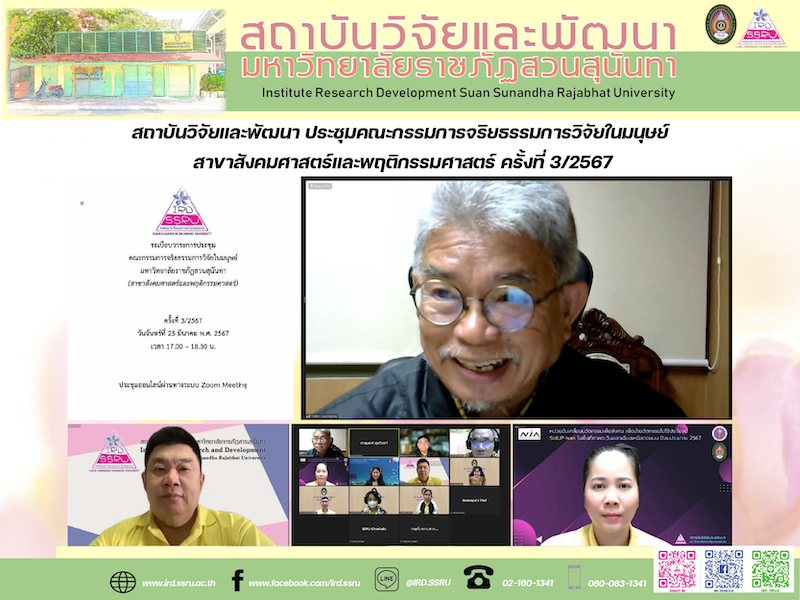 วันที่ 25 มีนาคม 2567 เวลา 17.00 น. สถาบันวิจัยและพัฒนา มหาวิทยาลัยราชภัฏสวนสุนันทา ประชุมคณะกรรมการจริยธรรมการวิจัยในมนุษย์ สาขาสังคมศาสตร์และพฤติกรรมศาสตร์ ครั้งที่ 3/2567 ในรูปแบบออนไลน์ผ่านระบบ Zoom Meeting โดยมี รองศาสตราจารย์ ดร.โยธิน แสวงดี เป็นประธาน พร้อมด้วย รองศาสตราจารย์ ดร.บัณฑิต ผังนิรันดร์ รองอธิการบดีฝ่ายวิจัยและพัฒนา รองศาสตราจารย์ ดร.รจนา จันทราสา ผู้อำนวยการสถาบันวิจัยและพัฒนา ผู้ช่วยศาสตราจารย์ ดร.ยุทธนา สุดเจริญ รองผู้อำนวยการฝ่ายบริหาร ศาสตราจารย์ ดร.รวีวรรณ ชินะตระกูล รองศาสตราจารย์ ดร.ยงยุทธ แฉล้มวงษ์ รองศาสตราจารย์เสาวภา ไพทยวัฒน์ อาจารย์ชลลดา ชูวณิชชานนท์ คณะกรรมการและคณะทำงานที่เกี่ยวข้องเข้าร่วมประชุม โดยในการประชุมดังกล่าวมีวาระการประชุมเรื่อง รายงานผลการรับรองโครงการวิจัยแบบพิจารณาแบบเร็ว (Expedited) แจ้งการเข้าร่วมตรวจรับรองคุณภาพคณะกรรมการจริยธรรมการวิจัยในมนุษย์ (NECAST) และเรื่องอื่นๆ ที่เกี่ยวข้อง ซึ่งการดำเนินการนี้สอดคล้องกับเป้าหมายการพัฒนาอย่างยั่งยืน (SDGs) ในเป้าหมายที่ 10 การลดความเหลื่อมล้ำ และเป้าหมายที่ 16 การเป็นมหาวิทยาลัยที่เข้มแข็ง มีความยุติธรรมและมีสันติภาพ