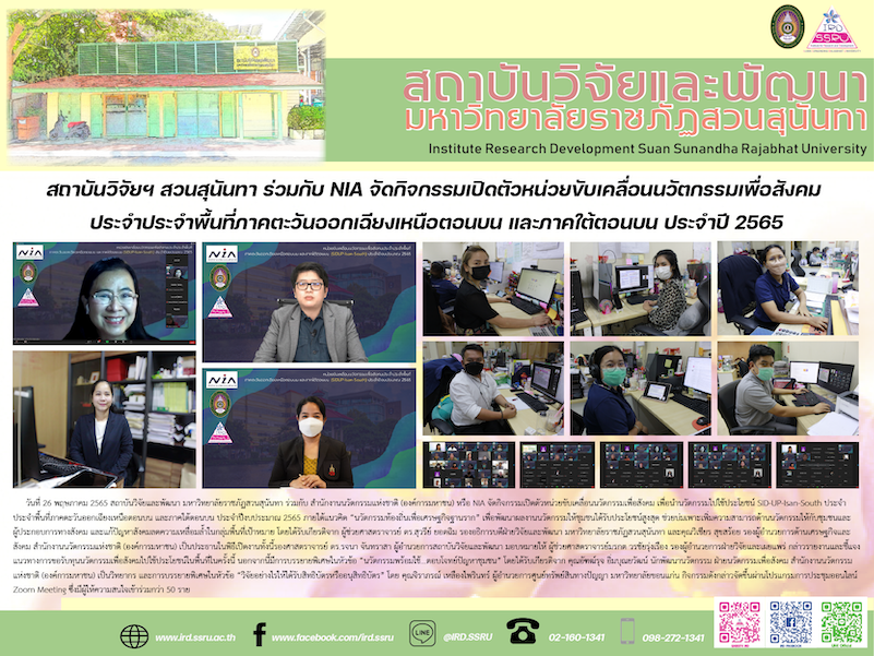 วันที่ 26 พฤษภาคม 2565 สถาบันวิจัยและพัฒนา มหาวิทยาลัยราชภัฏสวนสุนันทา ร่วมกับ สำนักงานนวัตกรรมแห่งชาติ (องค์การมหาชน) หรือ NIA จัดกิจกรรมเปิดตัวหน่วยขับเคลื่อนนวัตกรรมเพื่อสังคม เพื่อนำนวัตกรรมไปใช้ประโยชน์ SID-UP-Isan-South ประจำประจำพื้นที่ภาคตะวันออกเฉียงเหนือตอนบน และภาคใต้ตอนบน ประจำปีงบประมาณ 2565 ภายใต้แนวคิด “นวัตกรรมท้องถิ่นเพื่อเศรษฐกิจฐานราก” เพื่อพัฒนาผลงานนวัตกรรมให้ชุมชนได้รับประโยชน์สูงสุด ช่วยบ่มเพาะเพิ่มความสามารถด้านนวัตกรรมให้กับชุมชนและผู้ประกอบการทางสังคม และแก้ปัญหาสังคมลดความเหลื่อมล้ำในกลุ่มพื้นที่เป้าหมาย โดยได้รับเกียรติจาก ผู้ช่วยศาสตราจารย์ ดร.สุวรีย์ ยอดฉิม รองอธิการบดีฝ่ายวิจัยและพัฒนา มหาวิทยาลัยราชภัฏสวนสุนันทา และคุณวิเชียร สุขสร้อย รองผู้อำนวยการด้านเศรษฐกิจและสังคม สำนักงานนวัตกรรมแห่งชาติ (องค์การมหาชน) เป็นประธานในพิธีเปิดงานทั้งนี้รองศาสตราจารย์ ดร.รจนา จันทราสา ผู้อำนวยการสถาบันวิจัยและพัฒนา มอบหมายให้ ผู้ช่วยศาสตราจารย์มรกต วรชัยรุ่งเรือง รองผู้อำนวยการฝ่ายวิจัยและเผยแพร่ กล่าวรายงานและชี้แจงแนวทางการขอรับทุนนวัตกรรมเพื่อสังคมไปใช้ประโยชน์ในพื้นที่ในครั้งนี้ นอกจากนี้มีการบรรยายพิเศษในหัวข้อ “นวัตกรรมพร้อมใช้...ตอบโจทย์ปัญหาชุมชน” โดยได้รับเกียรติจาก คุณอัฑฒ์รุจ อิ่มบุณยวัฒน์ นักพัฒนานวัตกรรม ฝ่ายนวัตกรรมเพื่อสังคม สำนักงานนวัตกรรมแห่งชาติ (องค์การมหาชน) เป็นวิทยากร และการบรรยายพิเศษในหัวข้อ “วิจัยอย่างไรให้ได้รับสิทธิบัตรหรืออนุสิทธิบัตร” โดย คุณจิราภรณ์ เหลืองไพรินทร์ ผู้อำนวยการศูนย์ทรัพย์สินทางปัญญา มหาวิทยาลัยขอนแก่น กิจกรรมดังกล่าวจัดขึ้นผ่านโปรแกรมการประชุมออนไลน์ Zoom Meeting ซึ่งมีผู้ให้ความสนใจเข้าร่วมกว่า 50 ราย