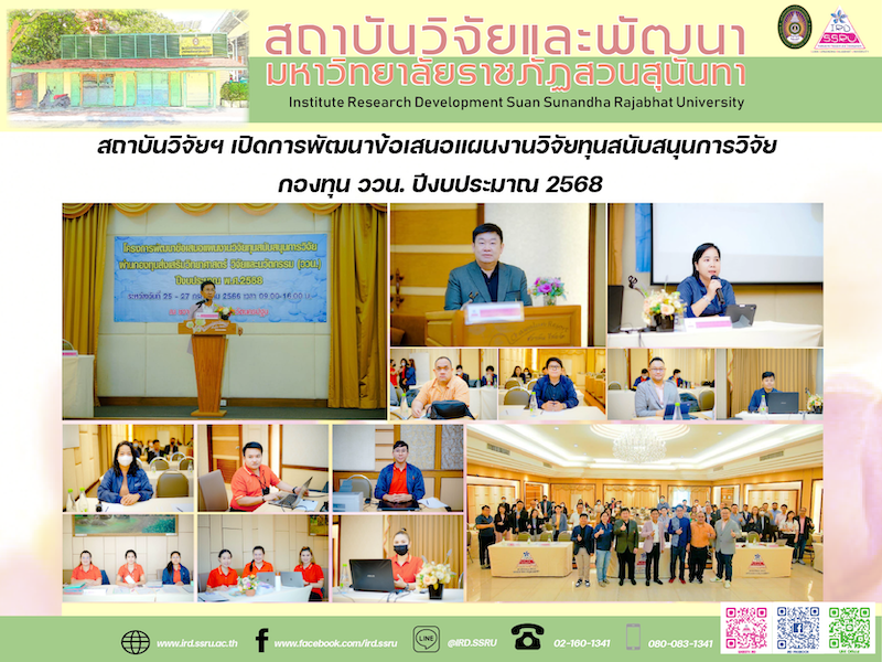 สถาบันวิจัยและพัฒนา มหาวิทยาลัยราชภัฏสวนสุนันทา เปิดโครงการพัฒนาข้อเสนอแผนงานวิจัยทุนสนับสนุนการวิจัย ผ่านกองทุนส่งเสริมวิทยาศาสตร์ วิจัยและนวัตกรรม (ววน.) ประจำปีงบประมาณ พ.ศ. 2568 ระหว่างวันที่ 25 - 27 กรกฎาคม 2566 ณ โรงแรมชวาลัน รีสอร์ท จังหวัดนครปฐม โดยได้รับเกียรติจาก รองศาสตราจารย์ ดร.ฤาเดช เกิดวิชัย นายกสภามหาวิยาลัยราชภัฏสวนสุนันทา ให้เกียรติเป็นประธานกล่าวเปิดโครงการ รองศาสตราจารย์ ดร.บัณฑิต ผังนิรันดร์ รองอธิการบดีฝ่ายวิจัยและพัฒนา กล่าวรายงาน รองศาสตราจารย์ ดร.รจนา จันทราสา ผู้อำนวยการสถาบันวิจัยและพัฒนา บรรยายพิเศษในหัวข้อ “การทำความเข้าใจ การยื่นขอรับทุนสนับสนุนการวิจัยผ่านกองทุนส่งเสริมวิทยาศาสตร์ วิจัยและนวัตกรรม (ววน.) ปีงบประมาณ พ.ศ. 2568 พร้อมด้วย ผู้ช่วยศาสตราจารย์ ดร.ยุทธนา สุดเจริญ รองผู้อำนวยการฝ่ายบริหาร ผู้ช่วยศาสตราจารย์ ดร.มรกต วรชัยรุ่งเรือง รองผู้อำนวยการฝ่ายวิจัยและเผยแพร่ ผู้ช่วยศาสตราจารย์ ดร.วัฒน์ พลอยศรี รองผู้อำนวยการฝ่ายบริการวิชาการ อาจารย์อทิตยา บัวศรี ผู้จัดการหน่วยบ่มเพาะวิสาหกิจ นางสาวพรทิพย์ เรืองปราชญ์ หัวหน้าสำนักงาน และคณะทำงานสถาบันวิจัยและพัฒนา