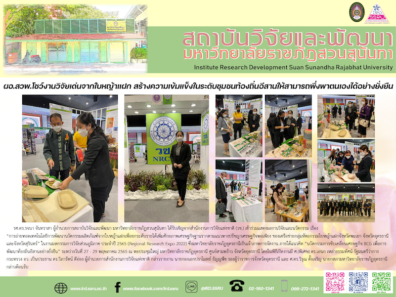 รศ.ดร.รจนา จันทราสา ผู้อำนวยการสถาบันวิจัยและพัฒนา มหาวิทยาลัยราชภัฏสวนสุนันทา ได้รับเชิญจากสำนักงานการวิจัยแห่งชาติ (วช.) เข้าร่วมแสดงผลงานวิจัยและนวัตกรรม เรื่อง “การถ่ายทอดเทคโนโลยีการพัฒนานวัตกรรมผลิตภัณฑ์จากใบหญ้าแฝกเพื่อยกระดับรายได้เพิ่มศักยภาพเศรษฐกิจฐานรากตามแนวทางปรัชญาเศรษฐกิจพอเพียง ของเครือข่ายกลุ่มหัตถกรรมใบหญ้าแฝกจังหวัดพะเยา จังหวัดอุดรธานี และจังหวัดสุรินทร์” ในงานมหกรรมการวิจัยส่วนภูมิภาค ประจำปี 2565 (Regional Research Expo 2022) ซึ่งมหาวิทยาลัยราชภัฏอุดรธานีเป็นเจ้าภาพการจัดงาน ภายใต้แนวคิด “นวัตกรรมการขับเคลื่อนเศรษฐกิจ BCG เพื่อการพัฒนาท้องถิ่นอีสานอย่างยั่งยืน” ระหว่างวันที่ 27 - 29 พฤษภาคม 2565 ณ หอประชุมใหญ่ มหาวิทยาลัยราชภัฏอุดรธานี ศูนย์สามพร้าว จังหวัดอุดรธานี โดยในพิธีเปิดงานมี ศ.(พิเศษ) ดร.เอนก เหล่าธรรมทัศน์ รัฐมนตรีว่าการกระทรวง อว. เป็นประธาน ดร.วิภารัตน์ ดีอ่อง ผู้อำนวยการสำนักงานการวิจัยแห่งชาติ กล่าวรายงาน นายกองเอกปราโมทย์ ธัญญพืช รองผู้ว่าราชการจังหวัดอุดรธานี และ ศ.ดร.วิรุณ ตั้งเจริญ นายกสภามหาวิทยาลัยราชภัฏอุดรธานี กล่าวต้อนรับ