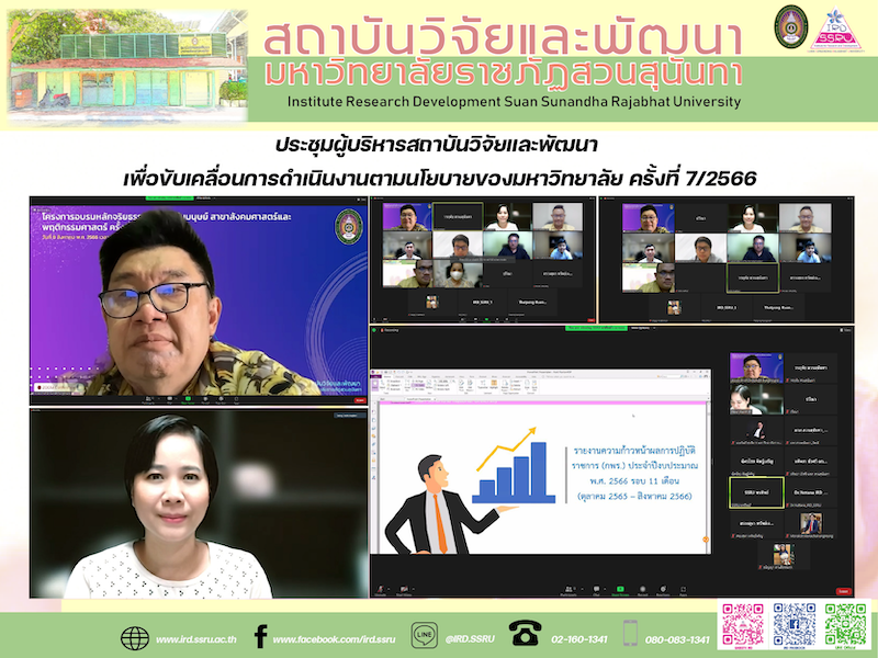 วันที่ 28 สิงหาคม 2566 เวลา 13.30 น. สถาบันวิจัยและพัฒนา มหาวิทยาลัยราชภัฏสวนสุนันทา ประชุมผู้บริหารสถาบันวิจัยและพัฒนา เพื่อรายงานสรุปการดำเนินงานของฝ่ายในสังกัด และการรายงานความก้าวหน้าผลการปฏิบัติราชการ (กพร.) ประจาปีงบประมาณ พ.ศ. 2566 รอบ 11 เดือน (ตุลาคม 2565 – สิงหาคม 2566) การรายงานความก้าวหน้าผลการดำเนินงานตัวชี้วัดตามแผนการดาเนินงานขับเคลื่อนมหาวิทยาลัยราชภัฏสวนสุนันทา ตามเกณฑ์ QS Ranking QS ด้านที่ 2 วิจัยและบริการวิชาการ ประจำปีงบประมาณ พ.ศ. 2566 ประจำเดือนสิงหาคม 2566 โดยมี รองศาสตราจารย์ ดร.บัณฑิต ผังนิรันดร์ รองอธิการบดีฝ่ายวิจัยและพัฒนา เป็นประธาน พร้อมด้วย รองศาสตราจารย์ ดร.รจนา จันทราสา ผู้อำนวยการสถาบันวิจัยและพัฒนา ผู้ช่วยศาสตราจารย์ ดร.ยุทธนา สุดเจริญ รองผู้อำนวยการฝ่ายบริหาร ผู้ช่วยศาสตราจารย์มรกต วรชัยรุ่งเรือง รองผู้อำนวยการฝ่ายวิจัยและเผยแพร่ ผู้ช่วยศาสตราจารย์ ดร.วัฒน์ พลอยศรี รองผู้อำนวยการฝ่ายบริการวิชาการ อาจารย์อทิตยา บัวศรี ผู้จัดการหน่วยบ่มเพาะวิสาหกิจ นางสาวพรทิพย์ เรืองปราชญ์ หัวหน้าสำนักงาน และบุคลากรหัวหน้าฝ่ายสถาบันวิจัยและพัฒนา เข้าร่วมประชุมในรูปแบบการประชุมออนไลน์