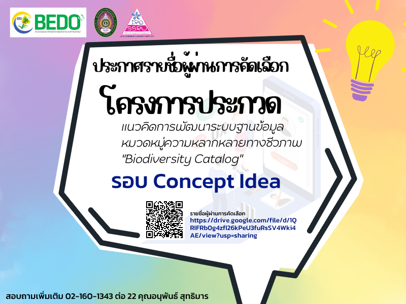 ประกาศรายชื่อผู้ผ่านการคัดเลือกโครงการประกวดแนวคิดการพัฒนาระบบฐานข้อมูลหมวดหมู่ความหลากหลายทางชีวภาพ "Biodiversity Catalog" (รอบ Concept Idea)