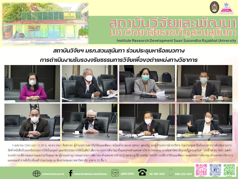 5 เมษายน 2565 เวลา 11.00 น. รศ.ดร.รจนา จันทราสา ผู้อำนวยการสถาบันวิจัยและพัฒนา พร้อมด้วย ผศ.ดร.ยุทธนา สุดเจริญ รองผู้อำนวยการฝ่ายบริหาร ร่วมประชุมหารือถึงแนวทางการดำเนินงานการจัดทำหนังสือรับรองจริยธรรมการวิจัยในมนุษย์ และจริยธรรมการวิจัยในสัตว์ เพื่อประกอบการพิจารณายื่นเสนอขอตำแหน่งทางวิชาการของคณาจารย์มหาวิทยาลัยราชภัฏสวนสุนันทา โดยมี รศ.ดร.วิทยา เมฆขำ รองอธิการบดีฝ่ายแผนงานและประกันคุณภาพ (ผู้ช่วยเลขานุการคณะกรรมการพิจารณาตำแหน่งทางวิชาการ) ผศ.ดร.สุวรีย์ ยอดฉิม รองอธิการบดีฝ่ายวิจัยและพัฒนา คณะกรรมการพิจารณาตำแหน่งทางวิชาการ และคณะทำงานที่เกี่ยวข้องเข้าร่วมประชุม ณ ห้องประชุมสภามหาวิทยาลัย อาคาร 31 ชั้น 5