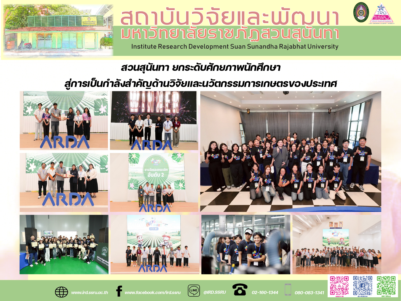ระหว่างวันที่ 23–25 มีนาคม 2569 สถาบันวิจัยและพัฒนา มหาวิทยาลัยราชภัฏสวนสุนันทา ส่งนักศึกษาเข้าร่วมโครงการค่ายอบรม “Young Smart ARDA รุ่นที่ 1” ซึ่งจัดโดย สำนักงานพัฒนาการวิจัยการเกษตร (องค์การมหาชน) (สวก.) ณ พิพิธภัณฑ์เกษตรเฉลิมพระเกียรติพระบาทสมเด็จพระเจ้าอยู่หัว (องค์การมหาชน) จังหวัดปทุมธานี