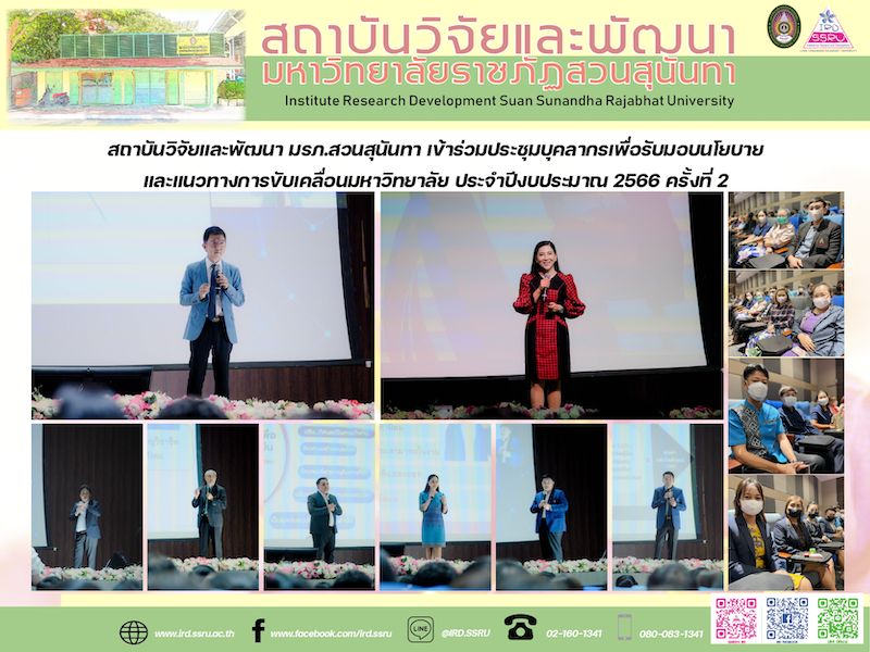 วันศุกร์ที่ 7 กรกฎาคม 2566 เวลา 08.30 – 12.00 น. สถาบันวิจัยและพัฒนา มหาวิทยาลัยราชภัฏสวนสุนันทา เข้าร่วมการประชุมมอบนโยบายบุคลากรมหาวิทยาลัยราชภัฏสวนสุนันทา ประจำปีงบประมาณ 2566 ครั้งที่ 2 โดยมีคณะผู้บริหารมหาวิทยาลัยราชภัฏสวนสุนันทา รองศาสตราจารย์ ดร.ฤๅเดช เกิดวิชัย นายกสภามหาวิทยาลัย รองศาสตราจารย์ ดร.ชุติกาญจน์ ศรีวิบูลย์ อธิการบดี และคณะผู้บริหารของมหาวิทยาลัย ให้เกียรติบรรยายพิเศษและมอบนโยบายแนวทางการปฏิบัติงานในการขับเคลื่อนมหาวิทยาลัย ณ หอประชุมสุนันทานุสรณ์ มหาวิทยาลัยราชภัฏสวนสุนันทา ซึ่งมีบุคลากรสถาบันวิจัยและพัฒนาเข้าร่วมรับทราบนโยบายโดยพร้อมเพรียงกัน