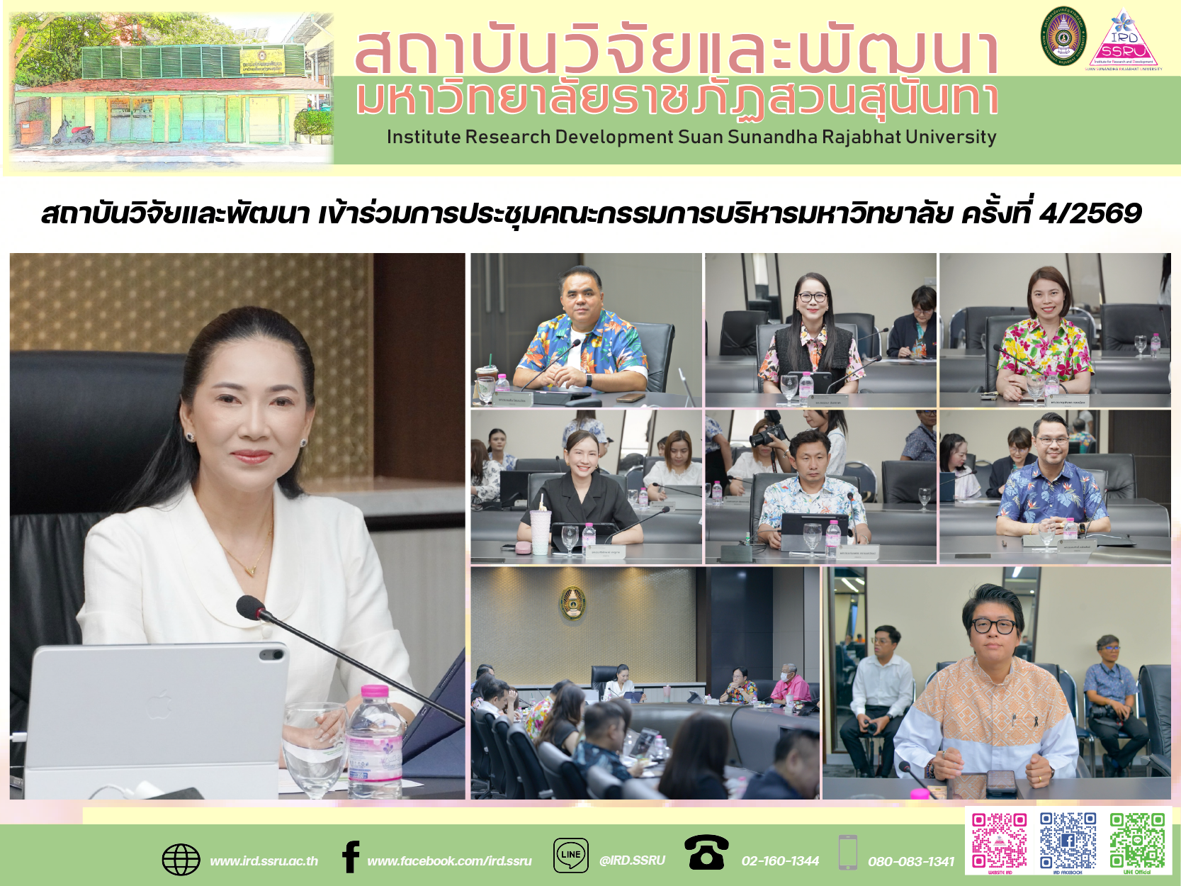 วันที่ 7 เมษายน 2569 เวลา 08.30 น. สถาบันวิจัยและพัฒนา มหาวิทยาลัยราชภัฏสวนสุนันทา เข้าร่วมการประชุมคณะกรรมการบริหารมหาวิทยาลัย (ก.บ.ม.) ครั้งที่ 4/2569 ณ ห้องประชุมสภามหาวิทยาลัย โดยมี รองศาสตราจารย์ ดร.ชุติกาญจน์ ศรีวิบูลย์ อธิการบดีมหาวิทยาลัยราชภัฏสวนสุนันทา เป็นประธานการประชุม พร้อมด้วยผู้บริหารมหาวิทยาลัย คณะ และหน่วยงานต่าง ๆ เข้าร่วมการประชุมอย่างพร้อมเพรียง