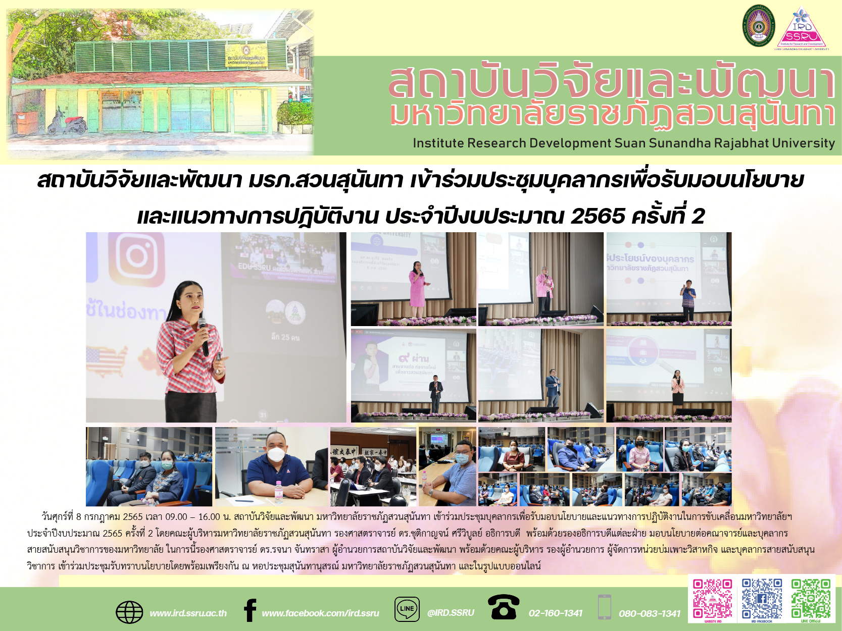 วันศุกร์ที่ 8 กรกฎาคม 2565 เวลา 09.00 – 16.00 น. สถาบันวิจัยและพัฒนา มหาวิทยาลัยราชภัฏสวนสุนันทา เข้าร่วมประชุมบุคลากรเพื่อรับมอบนโยบายและแนวทางการปฏิบัติงานในการขับเคลื่อนมหาวิทยาลัยฯ ประจำปีงบประมาณ 2565 ครั้งที่ 2 โดยคณะผู้บริหารมหาวิทยาลัยราชภัฏสวนสุนันทา รองศาสตราจารย์ ดร.ชุติกาญจน์ ศรีวิบูลย์ อธิการบดี พร้อมด้วยรองอธิการบดีแต่ละฝ่าย มอบนโยบายต่อคณาจารย์และบุคลากรสายสนับสนุนวิชาการของมหาวิทยาลัย ในการนี้รองศาสตราจารย์ ดร.รจนา จันทราสา ผู้อำนวยการสถาบันวิจัยและพัฒนา พร้อมด้วยคณะผู้บริหาร รองผู้อำนวยการ ผู้จัดการหน่วยบ่มเพาะวิสาหกิจ และบุคลากรสายสนับสนุนวิชาการ เข้าร่วมประชุมรับทราบนโยบายโดยพร้อมเพรียงกัน ณ หอประชุมสุนันทานุสรณ์ มหาวิทยาลัยราชภัฏสวนสุนันทา และในรูปแบบออนไลน์