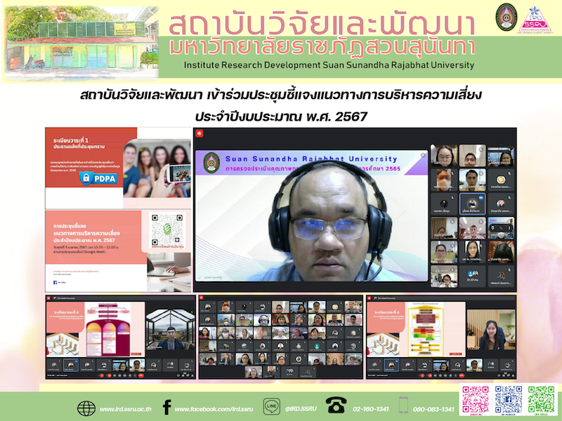 เมื่อวันที่ 5 เมษายน 2567 ที่ผ่านมา รองศาสตราจารย์ ดร.รจนา จันทราสา ผู้อำนวยการสถาบันวิจัยและพัฒนา มหาวิทยาลัยราชภัฏสวนสุนันทา มอบหมายให้ ผู้ช่วยศาสตราจารย์ ดร.ยุทธนา สุดเจริญ รองผู้อำนวยการฝ่ายบริหาร นายฉัตรไชย ดิษฐ์เจริญ หัวหน้าฝ่ายแผนงานและประกันคุณภาพ และนางสาวกนกพร เล็กซุง นักวิเคราะห์นโยบายและแผน เข้าร่วมประชุมชี้แจงแนวทางการบริหารความเสี่ยง ประจำปีงบประมาณ พ.ศ. 2567 ผ่านระบบประชุมออนไลน์ Google Meet โดยมี รองศาสตราจารย์ ดร.วิทยา เมฆขำ รองอธิการบดีฝ่ายแผนงานและประกันคุณภาพ เป็นประธานการประชุม