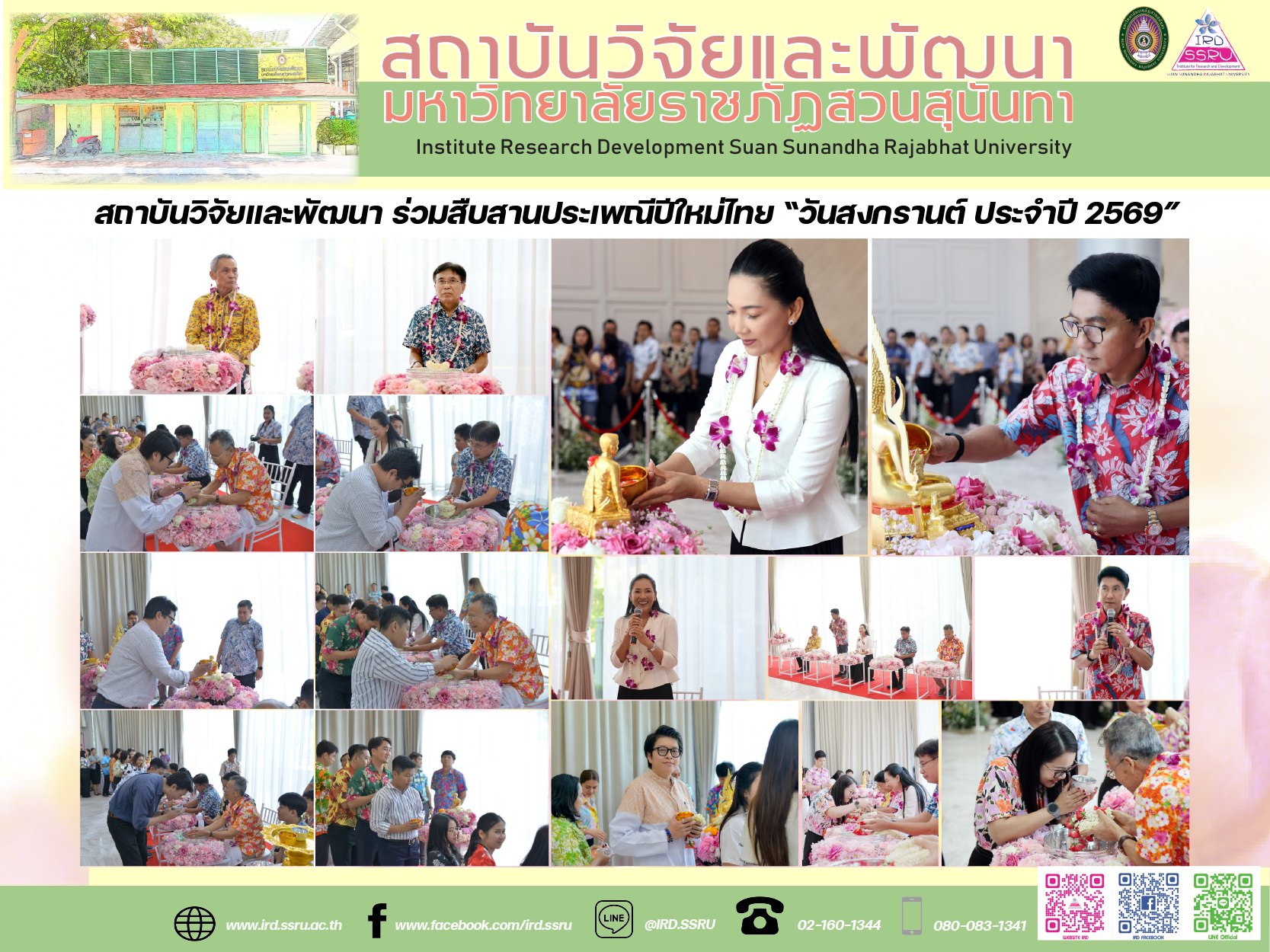 วันที่ 7 เมษายน 2569 สถาบันวิจัยและพัฒนา มหาวิทยาลัยราชภัฏสวนสุนันทา เข้าร่วมกิจกรรมสืบสานประเพณีไทย เนื่องในโอกาสวันขึ้นปีใหม่ไทย “วันสงกรานต์ ประจำปี 2569” โดยร่วมสรงน้ำพระพุทธสุนันทากร และพระบรมรูปจำลองสมเด็จพระนางเจ้าสุนันทากุมารีรัตน์ พระบรมราชเทวี เพื่อความเป็นสิริมงคล