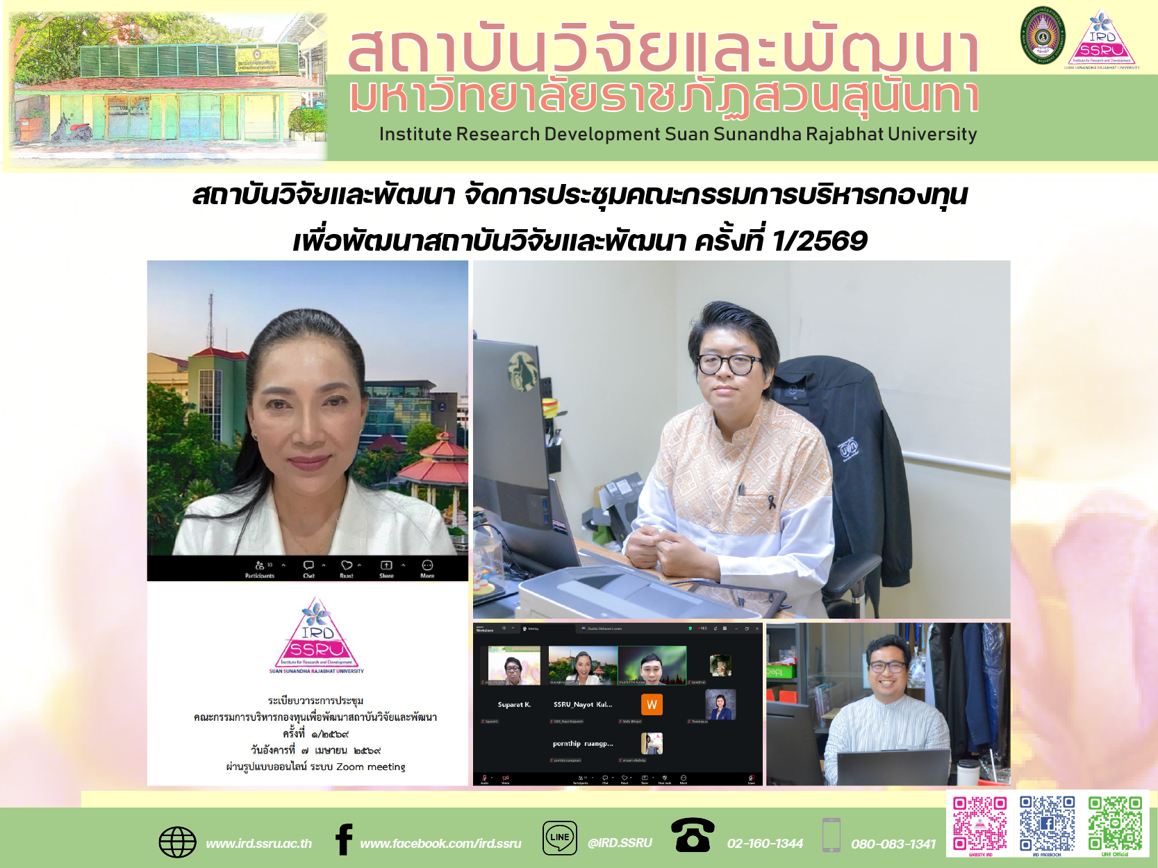 วันที่ 7 เมษายน 2569 สถาบันวิจัยและพัฒนา มหาวิทยาลัยราชภัฏสวนสุนันทา จัดการประชุมคณะกรรมการบริหารกองทุนเพื่อพัฒนาสถาบันวิจัยและพัฒนา ครั้งที่ 1/2569 ผ่านรูปแบบออนไลน์ ระบบ Zoom Meeting