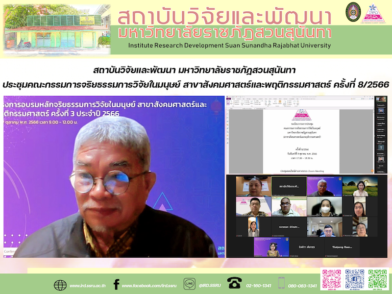 วันที่ 9 ตุลาคม 2566 สถาบันวิจัยและพัฒนา มหาวิทยาลัยราชภัฏสวนสุนันทา ประชุมคณะกรรมการจริยธรรมการวิจัยในมนุษย์ สาขาสังคมศาสตร์และพฤติกรรมศาสตร์ ครั้งที่ 8/2566 เพื่อร่วมพิจารณารายงานผลการรับรองโครงการวิจัยที่ขอรับการพิจารณาจริยธรรมการวิจัยในมนุษย์ สาขาสังคมศาสตร์และพฤติกรรมศาสตร์ โดยมี รองศาสตราจารย์ ดร.โยธิน แสวงดี เป็นประธาน พร้อมด้วย รองศาสตราจารย์ ดร.บัณฑิต ผังนิรันดร์ รองอธิการบดีฝ่ายวิจัยและพัฒนา รองศาสตราจารย์ ดร.รจนา จันทราสา ผู้อำนวยการสถาบันวิจัยและพัฒนา ผู้ช่วยศาสตราจารย์ ดร.ยุทธนา สุดเจริญ รองผู้อำนวยการฝ่ายบริหาร รองศาสตราจารย์ ดร.ยงยุทธ แฉล้มวงษ์ ศาสตราจารย์ ดร.รวีวรรณ ชินะตระกูล รองศาสตราจารย์เสาวภา ไพทยวัฒน์ อาจารย์ชลลดา ชูวณิชชานนท์ นางสาวพรทิพย์ เรืองปราชญ์ หัวหน้าสำนักงาน และคณะทำงานที่เกี่ยวข้องเข้าร่วมประชุม ในรูปแบบการประชุมออนไลน์ผ่านระบบ Zoom Meeting