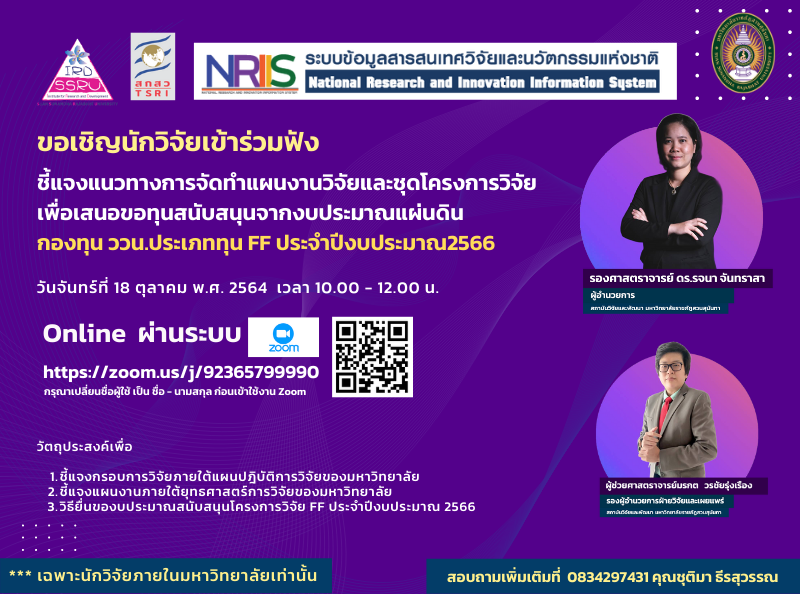 > ชี้แจงแนวทางการจัดทำแผนงานวิจัยและชุดโครงการวิจัย เพื่อเสนอขอทุนสนับสนุนจากงบประมาณแผ่นดิน กองทุน ววน.ประเภททุน FF ประจำปีงบประมาณ2566